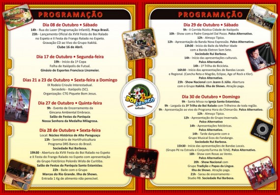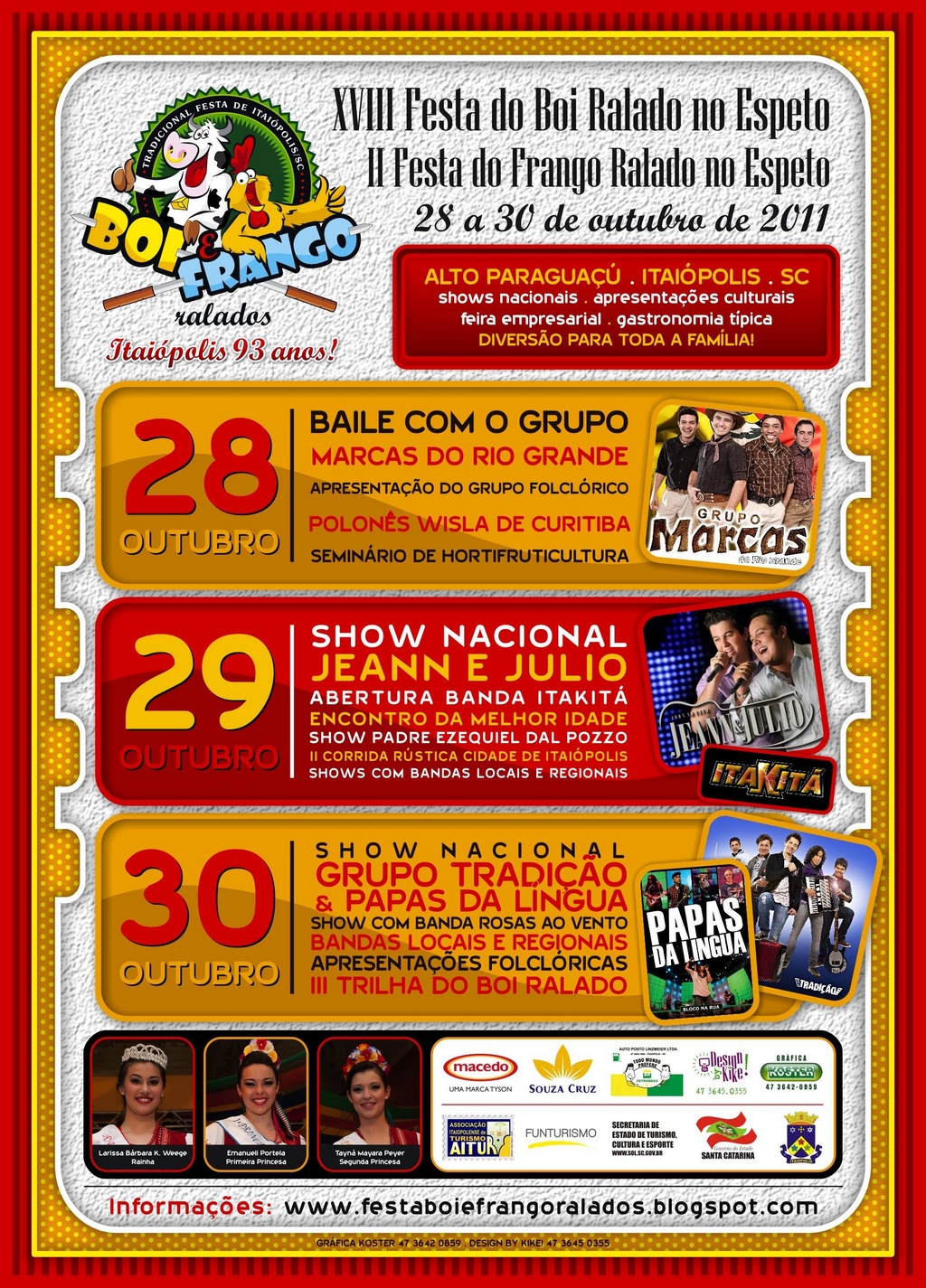 Confira a programação da XVIII Festa do Boi Ralado em Itaiópolis Publicado por Click Riomafra - 09/10/2011 - 20h32 – Clique na imagem para visualizá-la em tamanho maior. - Publicidade -