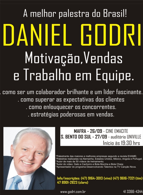 Show de bola…a melhor Palestra de todos os tempo o cara é Mestre em tecnicas de vendas e motivação..o Preço é justissimo, levando em relação que em outras cidades e quase todas maiores que Mafra a Palestra do Daniel Godri é bem mais cara…Aproveitem e aprendam com o Melhor.