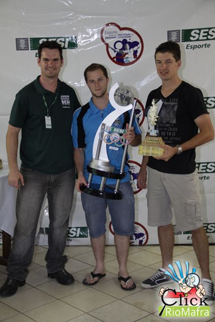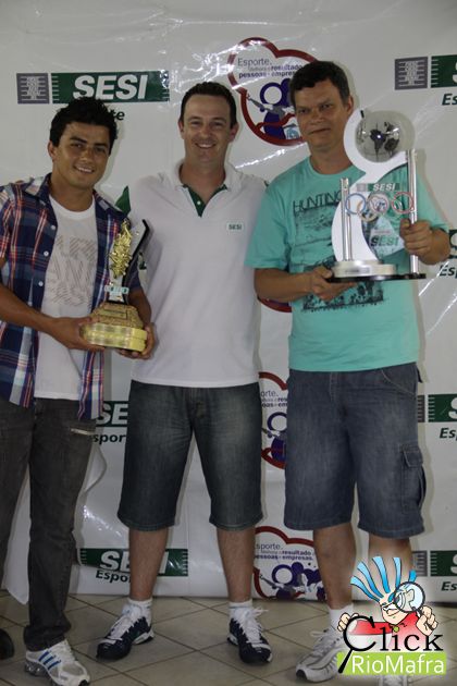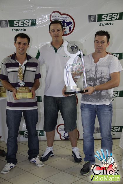 Representantes da Calhas Vila Nova, recebendo o troféu 3º lugar, entregue por Eduardo Martin Pedro (coordenador de atividades físicas do Sesi de Mafra)
