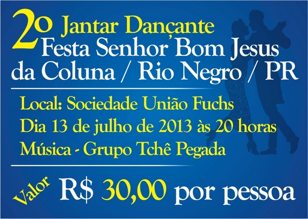 No próximo sábado, 13, será realizado o 1º evento em Louvor a Festa do Senhor Bom Jesus da Coluna e o 2º Jantar Dançante, em Rio Negro. O evento tem inÃcio à s 20h, e banda que irá animar a noite será Grupo Tchê Pegada, na Sociedade União Fuchs. Os ingressos estão R$ 30 por pessoa.