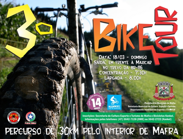 A Prefeitura de Mafra está preparando pelo terceiro ano consecutivo, com apoio da Secretaria Municipal da Cultura, Esporte e Turismo – Departamento de esportes, um evento para quem gosta de pedalar e ainda aproveitar as belezas da natureza. Trata-se do 3º Bike Tour de Mafra, programado para o dia 18 de março, com concentração à s 7h30 e saÃda à s 8h, em frente à Maxicar, no trevo da BR-116. O percurso será de 30 km pelo interior do municÃpio.