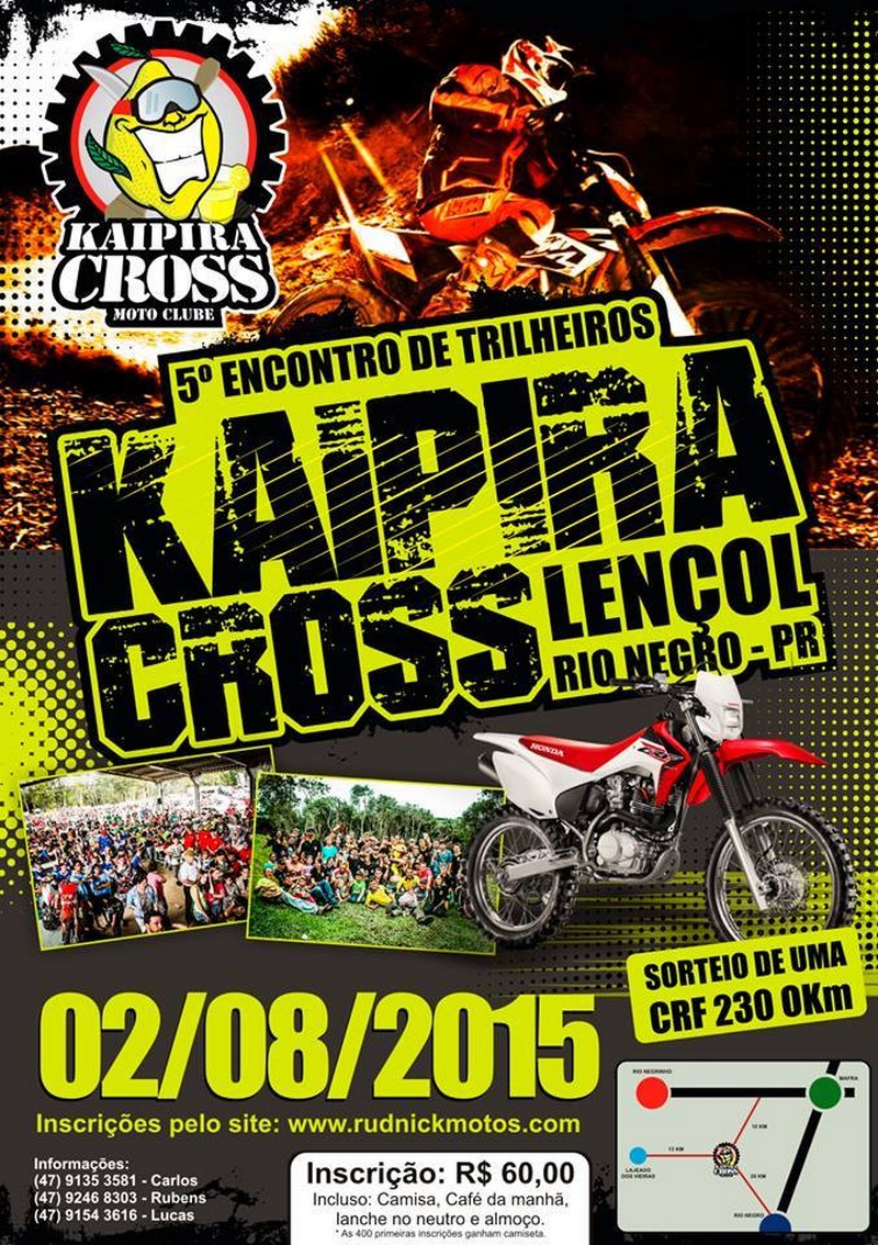 Será realizado no próximo domingo (2) o 5º Encontro de Trilheiros Kaipira Cross na localidade de Lençol, em Rio Negro. A taxa para participar é de R$ 60 e estão inclusos café da manhã, lanche durante o percurso e almoço. Os 400 primeiros inscritos ganharão uma camiseta do evento e todos os participantes vão concorrer ao sorteio de uma motocicleta CRF 230 zero-quilômetro.  Segundo os organizadores, serão 60 km percorridos pelos participantes durante o domingo. A largada será dada na Igreja de Santo Antônio no interior do município após o café da manhã servido aos trilheiros. A expectativa é que setecentas pessoas se inscrevem este ano, superando a marca do ano anterior, quinhentos escritos. A festa é uma iniciativa do Kaipira Cross Moto Clube e a inscrição pode ser feita através do site www.rudnickmotos.com.br.