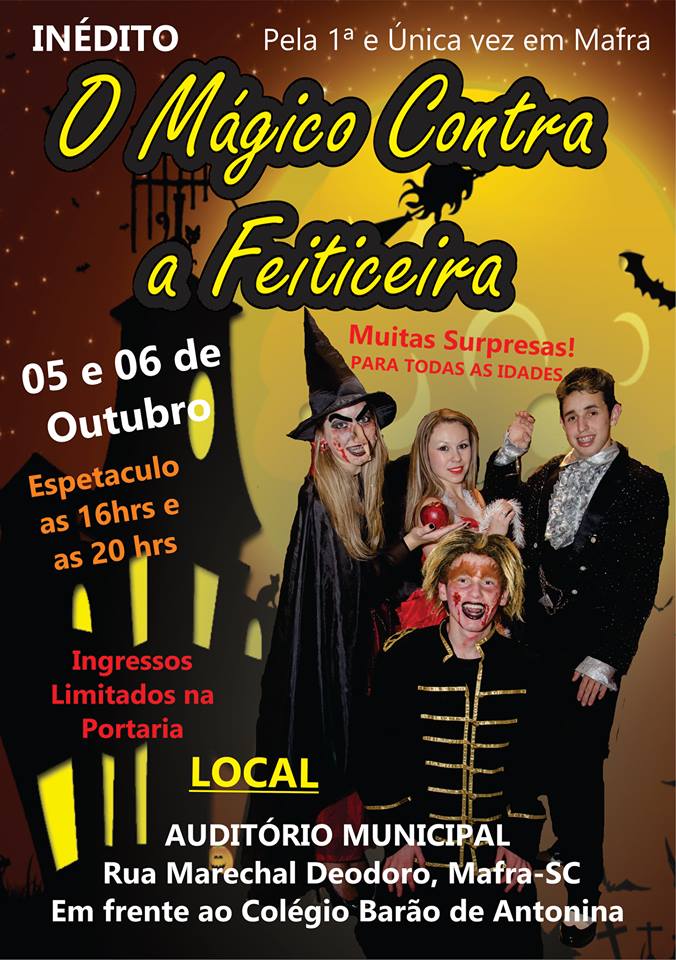 O mágico ilusionista mafrense Felipe Valério apresentará o espetáculo “O Mágico Contra a Feiticeira†nos dias 05 e 06 de outubro. A apresentação será no Auditório Municipal de Mafra em dois horários: as 16 e às 20h. Os ingressos serão limitados e estarão à venda na bilheteria ao custo de R$10,00/adulto e R$5,00/criança.