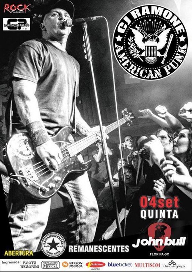 O ex-baixista da lendária banda nova-iorquina Ramones, que em 2002 ingressou do “Rock and Roll Hall of Fameâ€, o qual elege os nomes mais influentes da música, confirmou 12 apresentações no Brasil, e uma das paradas será em solo catarinense, sendo que o show de abertura ficará sob a responsabilidade da banda Os Remanescentes, escalados para subirem no palco e iniciarem a festa punk que acontecerá no próximo dia 4 de setembro no John Bull Lagoa, em Florianópolis. Aos interessados em prestigiar o evento, os ingressos podem ser adquiridos no site da “Blueticketâ€, pelo custo de R$ 50,00 (1º Lote).