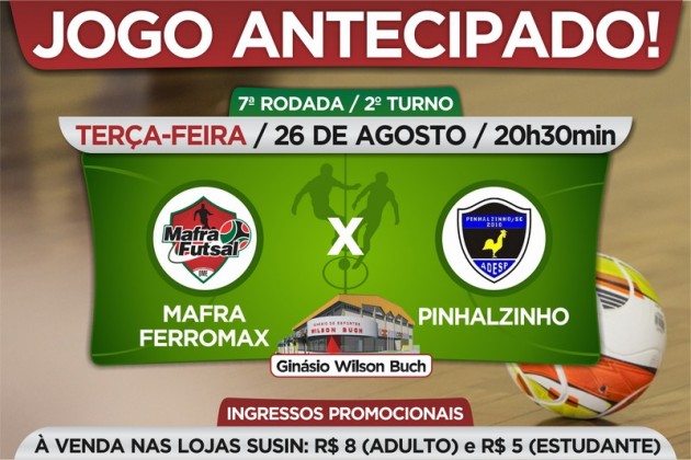 Jogo entre Mafra Ferromax e Pinhalzinho será na próxima terça-feira (26)