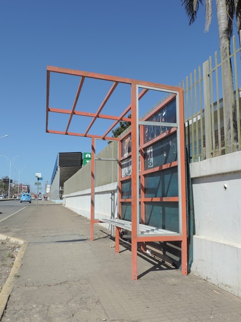 Ali próximo, no bairro Jardim Cristal encontramos um dos pontos totalmente danificado, sem parte da cobertura e sem proteção na parte de trás, fator em comum entre grande parte dos pontos visitados. Em dias de chuva forte o usuário não fica protegido mesmo em pontos onde há cobertura.