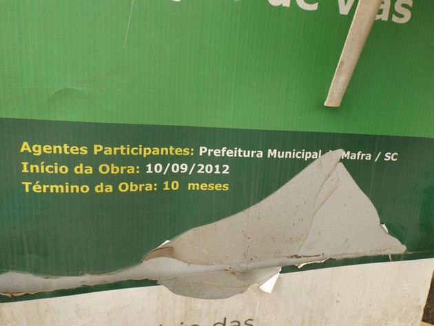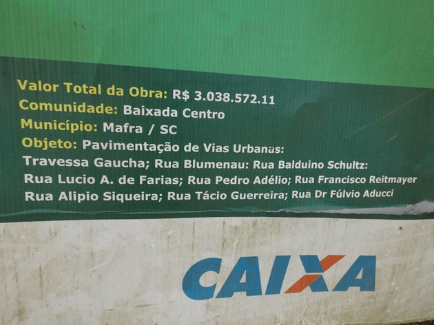 Obras no valor de R$ 3.038.572,11 que contemplariam o centro e a baixada de Mafra, nas ruas: Travessa Gaúcha, rua Blumenau, Balduíno Schultz, Lúcio A. de Farias, Pedro Adélio, Francisco Reitmayer, Alípio Siqueira, Tácio Guerreiro, Dr. Flúvio Aducci, que teriam que ser iniciadas em 10/09/2012 e terminadas dez meses depois, até hoje não foram sequer iniciadas dois anos após o prazo previsto.