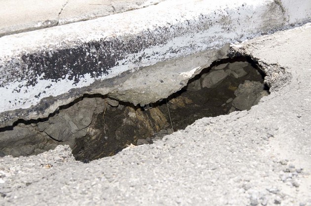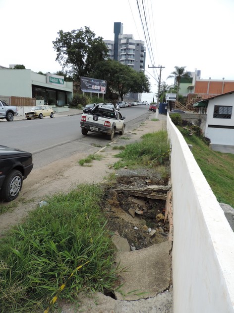 Na Frederico Heyse, próximo ao ginásio do Zeppelin, o buraco aberto pela Casan já quase engoliu um carro recentemente, foi tapado com terra e areia, porém continua em desnível, e as lajotas que cobriam o local, permanecem na calçada.