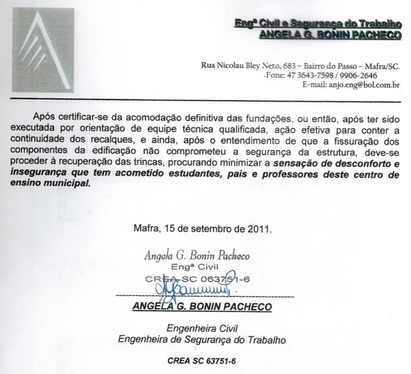 A Gazeta recebeu nas últimas semanas, relatos de mães que têm seus filhos estudando no Cemma – Centro de Educação do Município de Mafra e estão preocupadas com as rachaduras na estrutura da Ala 4. Esta semana a escola emitiu um aviso aos pais informando que as aulas para os alunos que já passaram de ano, estariam suspensas por motivo de reforma e os demais que ficaram recuperação teriam aula normalmente.