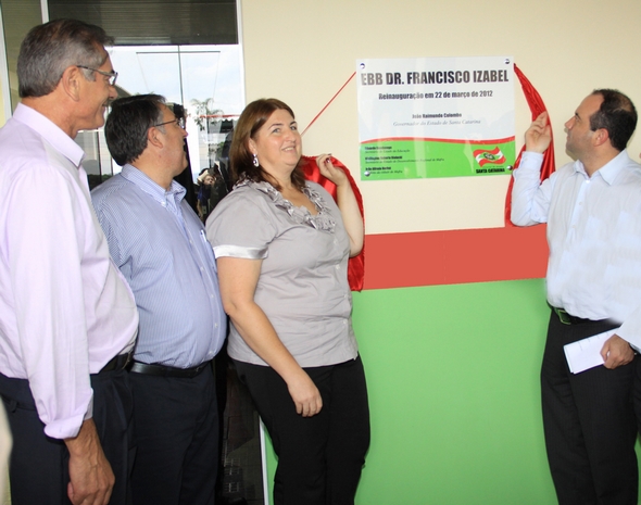 O governador Raimundo Colombo juntamente com os deputados Silvio Dreveck, Antonio Aguiar, o secretário de Estado de Desenvolvimento Regional Wellington Bielecki, o prefeito em exercício Paulo Sérgio Dutra, o presidente da Câmara Osni Martins, a diretora Sandra Regina Ribeiro, demais autoridades e comunidade presente inauguraram na tarde desta quinta-feira (22), as obras de reforma e ampliação da EEB Dr. Francisco Izabel.
