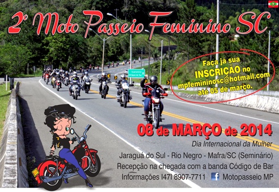 No dia 08 de março, Dia Internacional da Mulher, a cidade de Rio Negro receberá o 2º Moto Passeio Feminino SC. Mais de 140 mulheres, inclusive rionegrenses e mafrenses já estão inscritas para esta edição.
