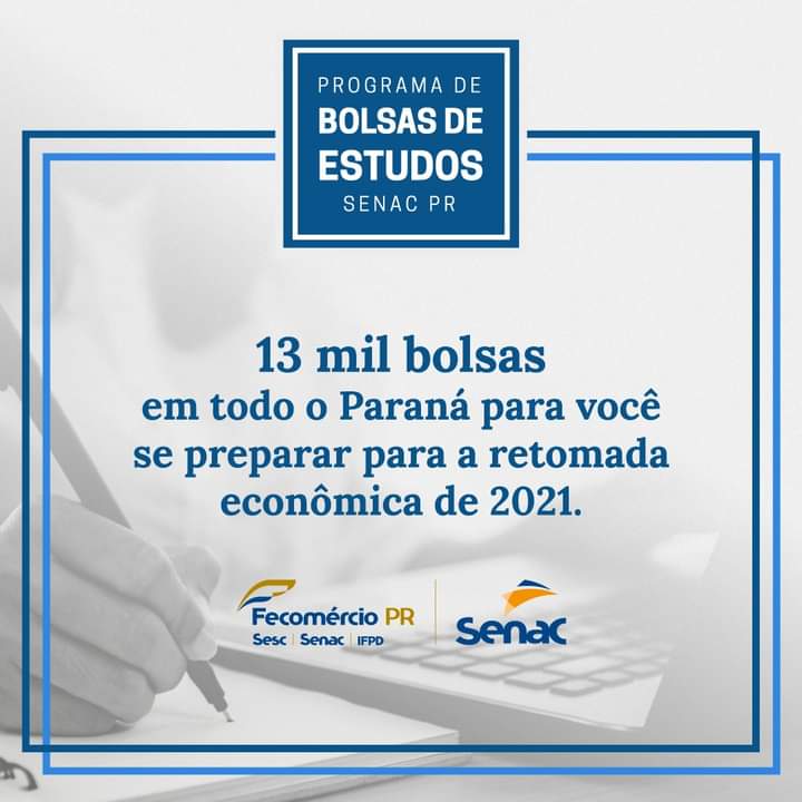 O Senac PR está ofertando 13 mil vagas gratuitas para todo o Estado, através do Programa de Bolsas de Estudos. Serão investidos mais de 18 milhões de reais para contribuir na formação profissional e auxiliar a retomada econômica do comércio de bens, serviço e turismo no Paraná.