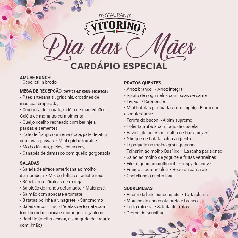 Nesse dia das mães seu almoço tem endereço certo: Restaurante Vitorino. Um cardápio mais que especial foi preparado com todo o carinho que elas merece. Faça sua reserva! Whatsapp (47) 9-8497-5002 ou pelo telefone 3641-7799. R$ 59,90 por pessoa. Vem pro Vitorino você também!