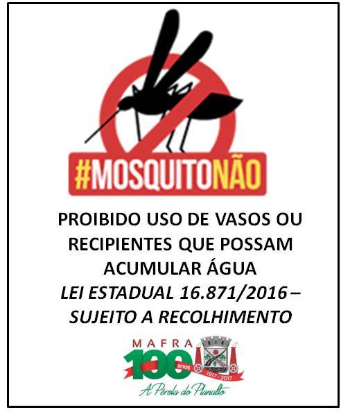 Embasada na Lei Estadual nº 16.871/2016 que dispõe sobre a obrigatoriedade de proprietários ou locatários de imóveis residenciais e comerciais públicos e privados adotarem medidas para evitar a existência de criadouros para Aedes aegypti, a placa afixada terá o seguinte texto: “Proibido uso de vasos ou recipientes que possam acumular água. Lei estadual 16.871/2016 – sujeito a recolhimento”.