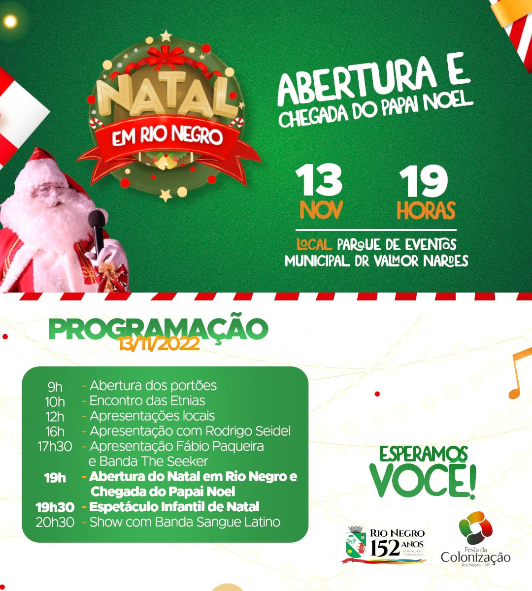 O Papai Noel chegará a Rio Negro durante a 18ª Festa da Colonização, que está sendo realizada em comemoração aos 152 anos de emancipação polÃtica do municÃpio.