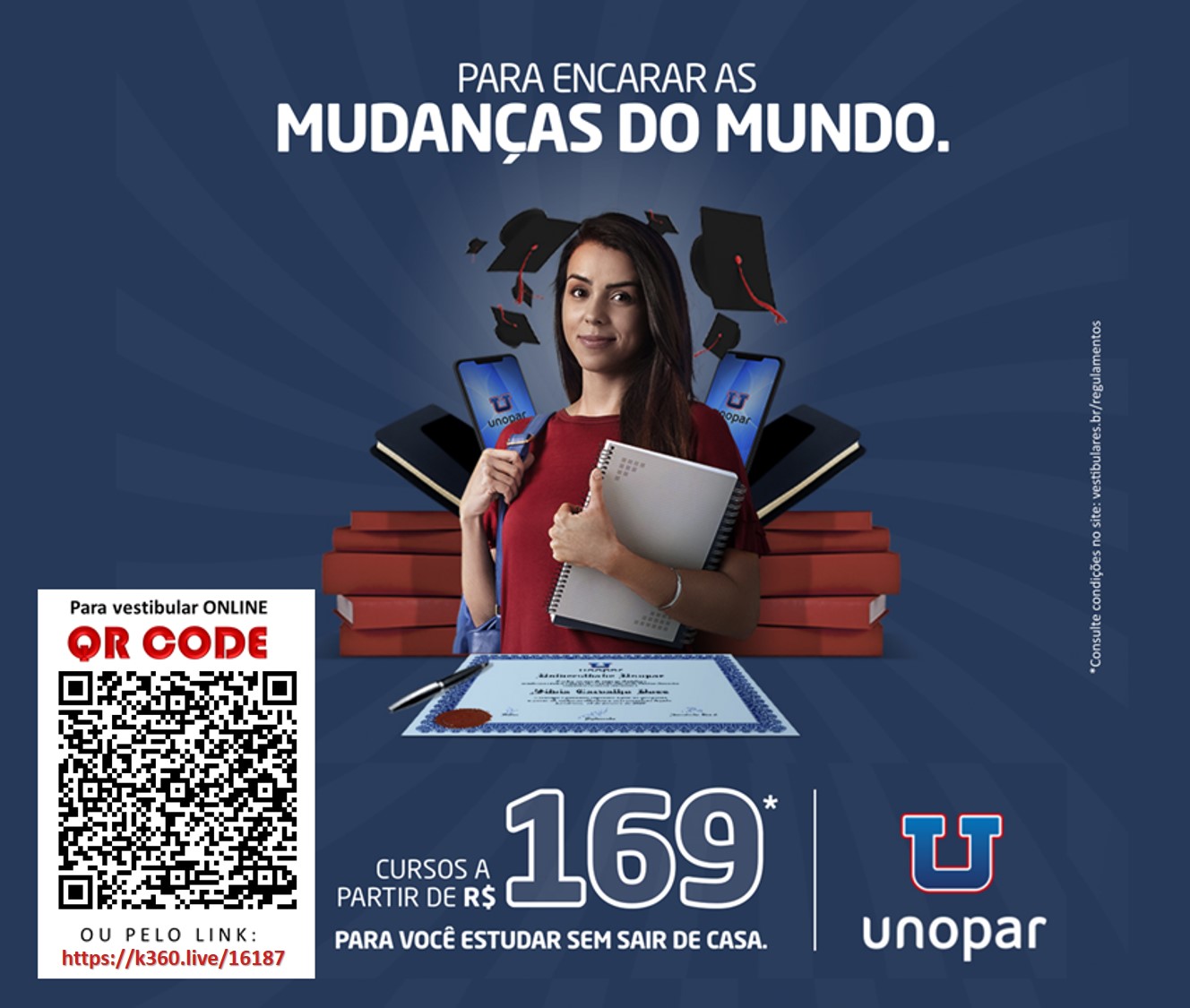 Aproveite para iniciar o segundo semestre com novos objetivos. Um ano que iniciou mudando a nossa forma de pensar e viver. Esse é o ano ideal para você se REINVENTAR, RECRIAR e principalmente TENTAR. E para encarar as mudanças do mundo, você precisa escolher a melhor, escolha a UNOPAR! Faça a sua inscrição gratuita para o vestibular online através do link: https://k360.live/16187 ou QRCODE disponÃvel na imagem.