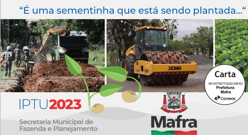 A Prefeitura de Mafra lançou os valores do IPTU 2023, divulgando os prazos e vencimento para cota única ou parcelamentos. Além de receber pelos Correios, os carnês já estão disponÃveis para consulta e emissão de guias no site oficial do MunicÃpio.