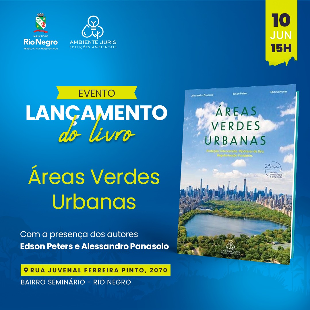 Nesta sexta-feira, 10 de junho, a Prefeitura Municipal de Rio Negro, através da Secretaria de Cultura e Turismo, realiza a solenidade de lançamento do livro Áreas Verdes Urbanas. O evento encerra a programação da Semana do Meio Ambiente no Município. Na ocasião, os autores Edson Peters e Alessandro Panasolo estarão presentes, recebendo o público. O evento acontece no Cine Teatro Antônio Cândido do Amaral, com início às 15h, com entrada gratuita.