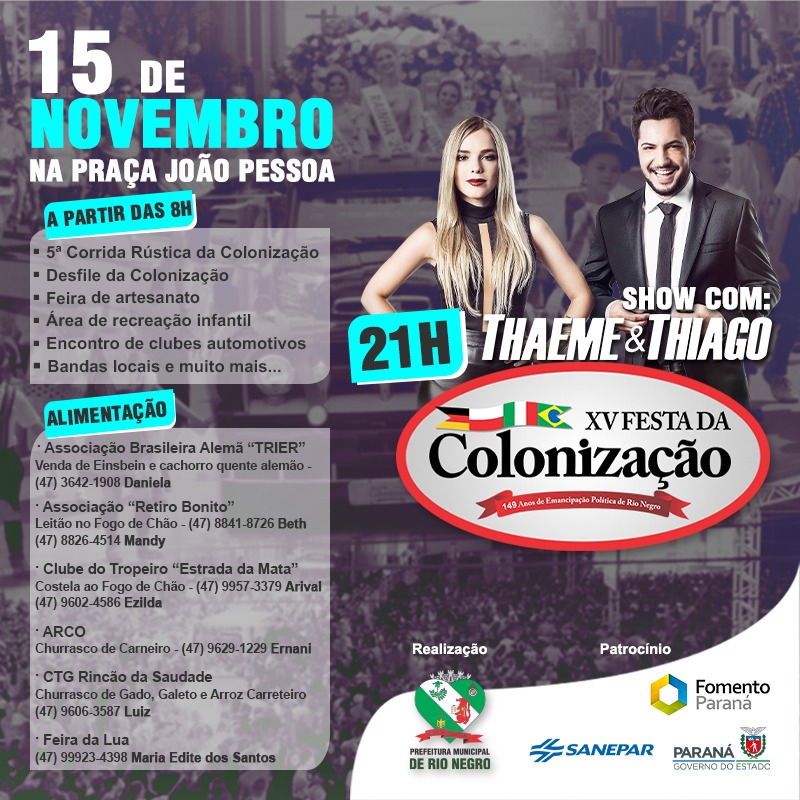 - Dia 15 de novembro: show nacional com Thaeme e Thiago