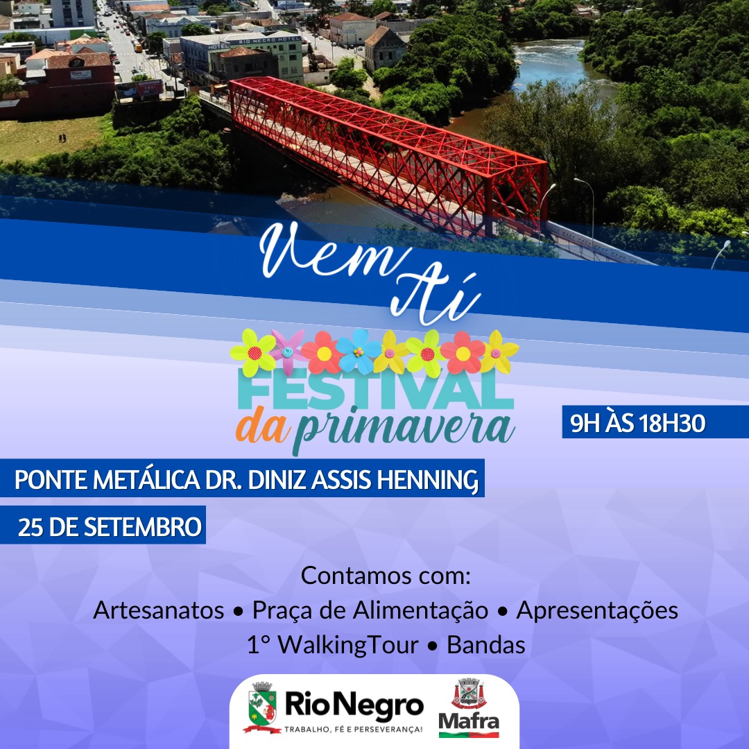 A população de Rio Negro e Mafra terá um dia cheio de atrações culturais neste mês de setembro. O Festival da Primavera será realizado na manhã e tarde do próximo dia 25 (domingo) na Ponte Dr. Diniz Assis Henning (popular Ponte Metálica).