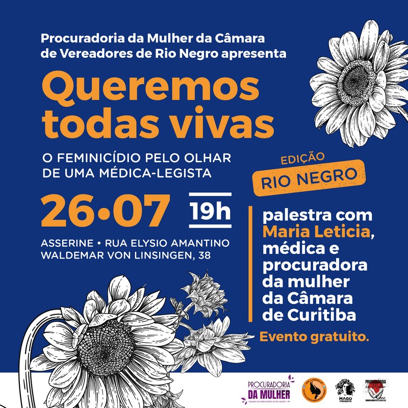 Rio Negro é a próxima cidade do estado a receber a palestra “Queremos todas vivas, o feminicídio pelo olhar de uma médica-legista”. O evento com entrada gratuita será na próxima terça-feira, dia 26 de julho, às 19h, na ASSERINE (Associação dos Servidores Públicos Municipais de Rio Negro). A iniciativa faz parte de uma ação da Procuradoria da Mulher de Curitiba com foco em todo o estado do Paraná e, em Rio Negro, tem apoio da Procuradoria da Mulher de Rio Negro e o Clube Soroptmista Internacional de Rio Negro.