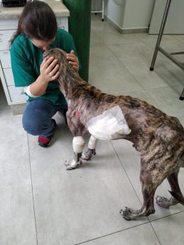 O cachorro Tigrão – que foi cruelmente arrastado por 2 km por um carro em Rio Negro – segue internado no Hospital Veterinário São Bento, mas felizmente está se recuperando. Ele já consegue se levantar sozinho e caminhar (ainda com dificuldade, mas até dias atrás ele estava com os movimentos paralisados). As feridas também estão melhorando.
