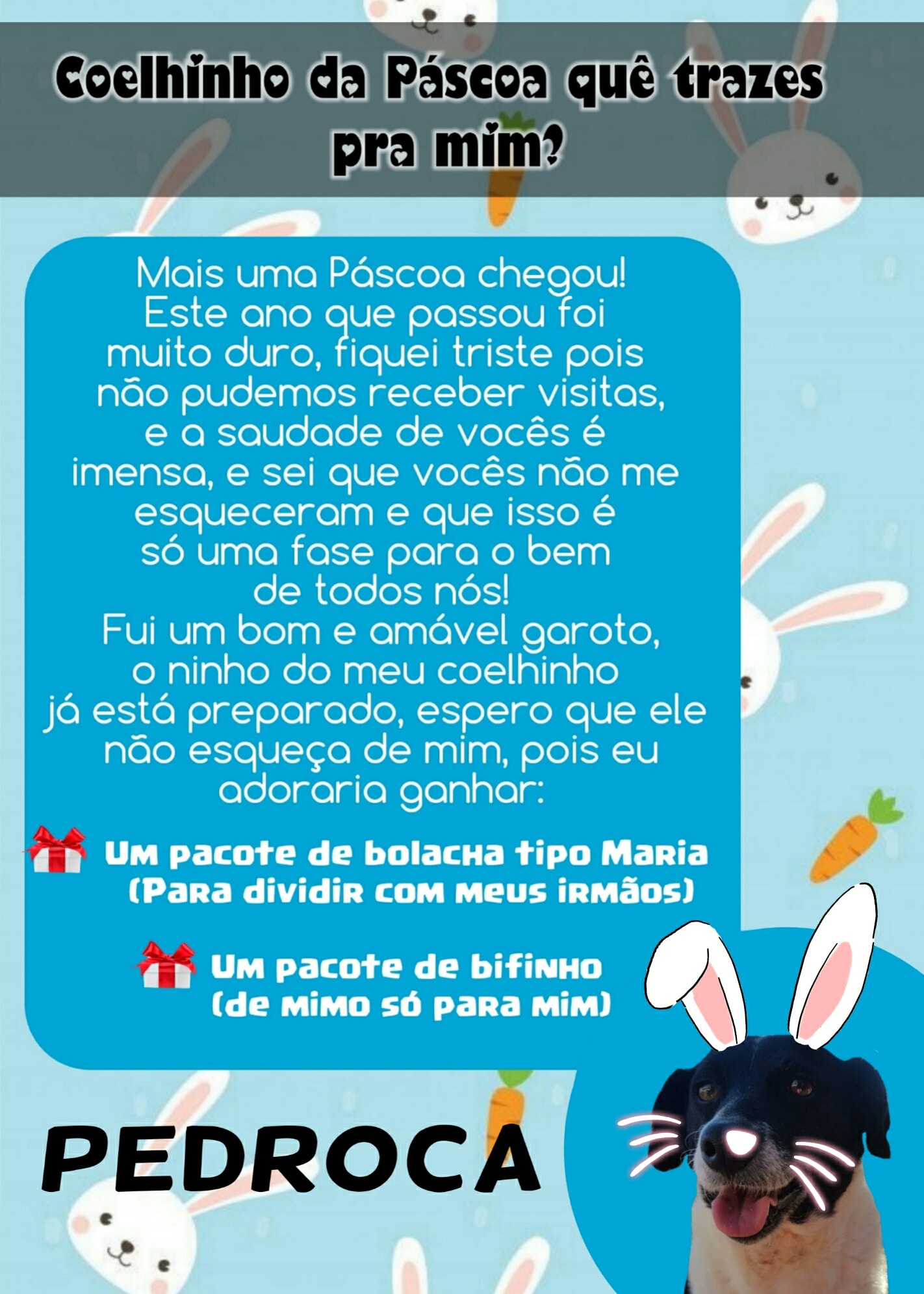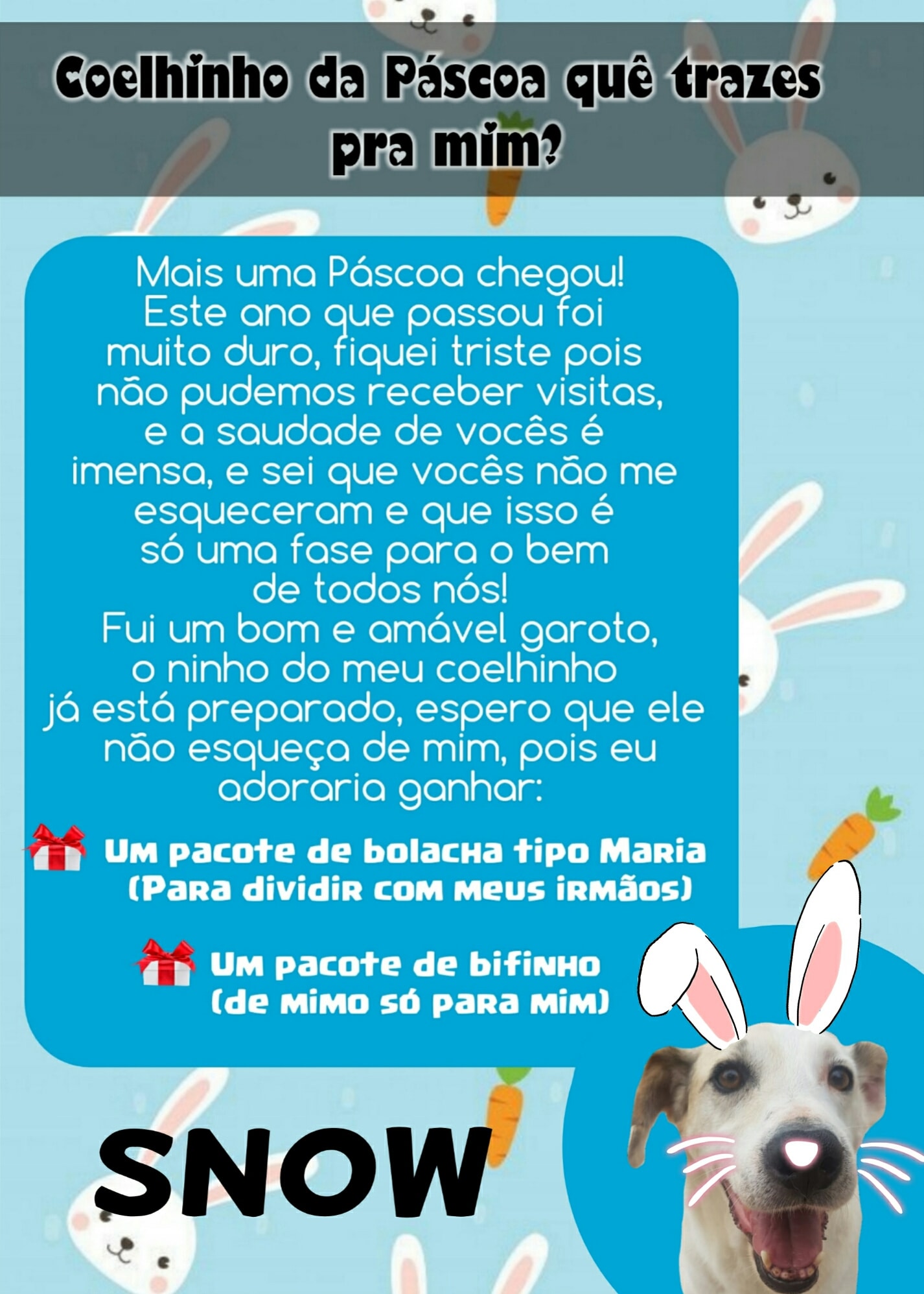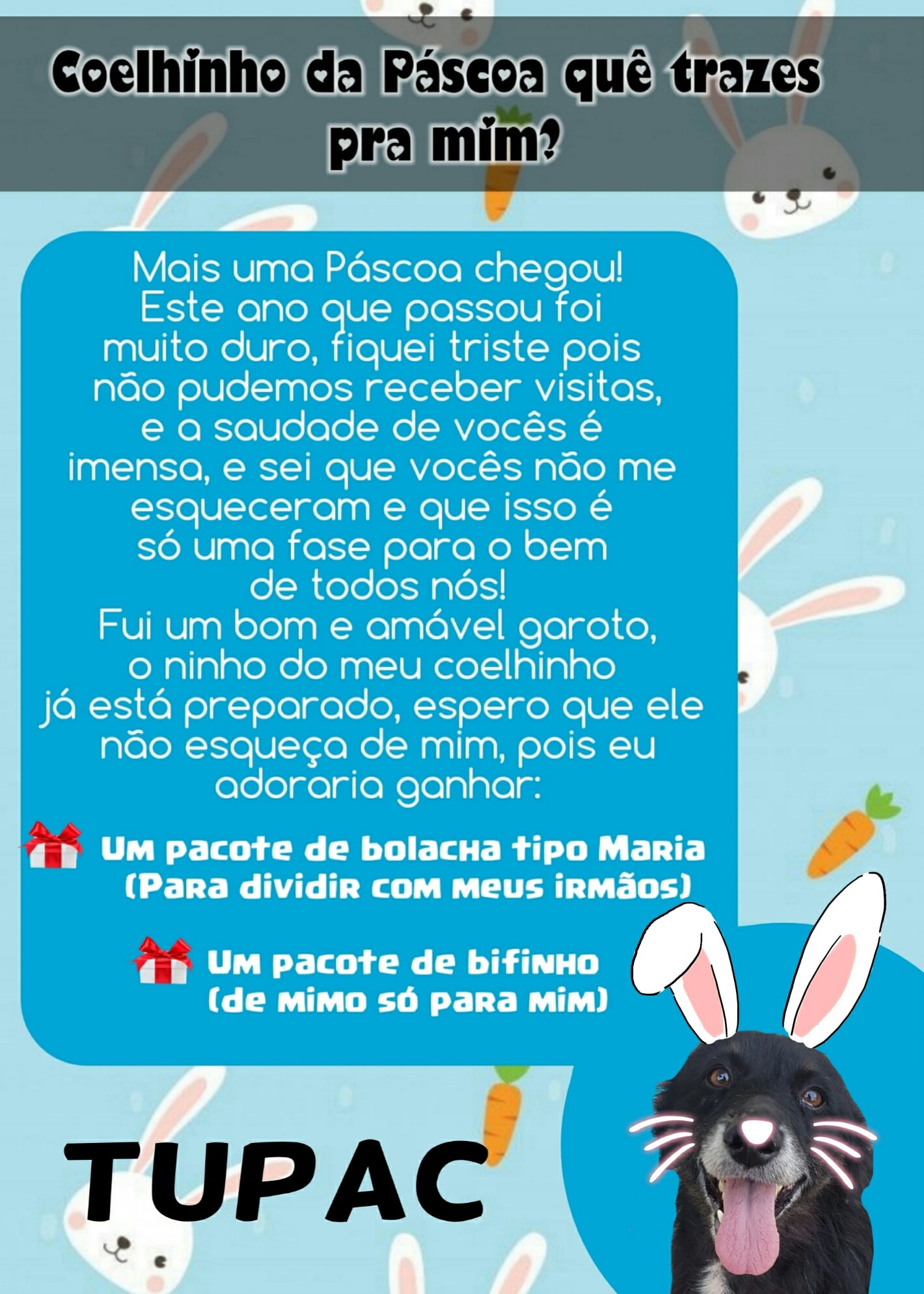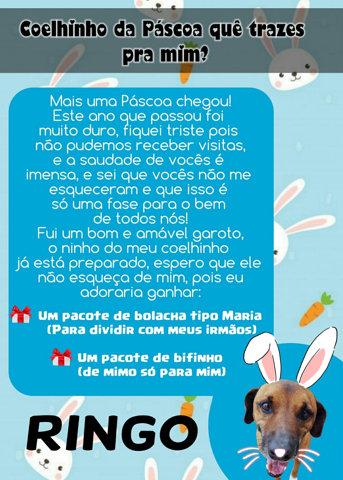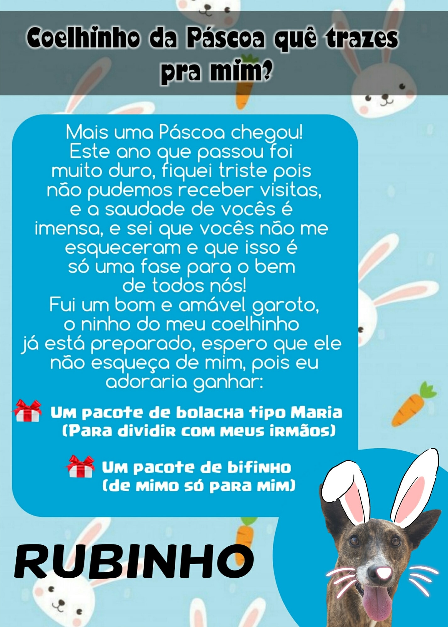 Para esta Páscoa o Abrigo de Cães São Francisco de Assis novamente possui as cartinhas, onde a população pode colaborar doando mimos para os cães (pacote de bolacha tipo Maria ou pacote de bifinho).