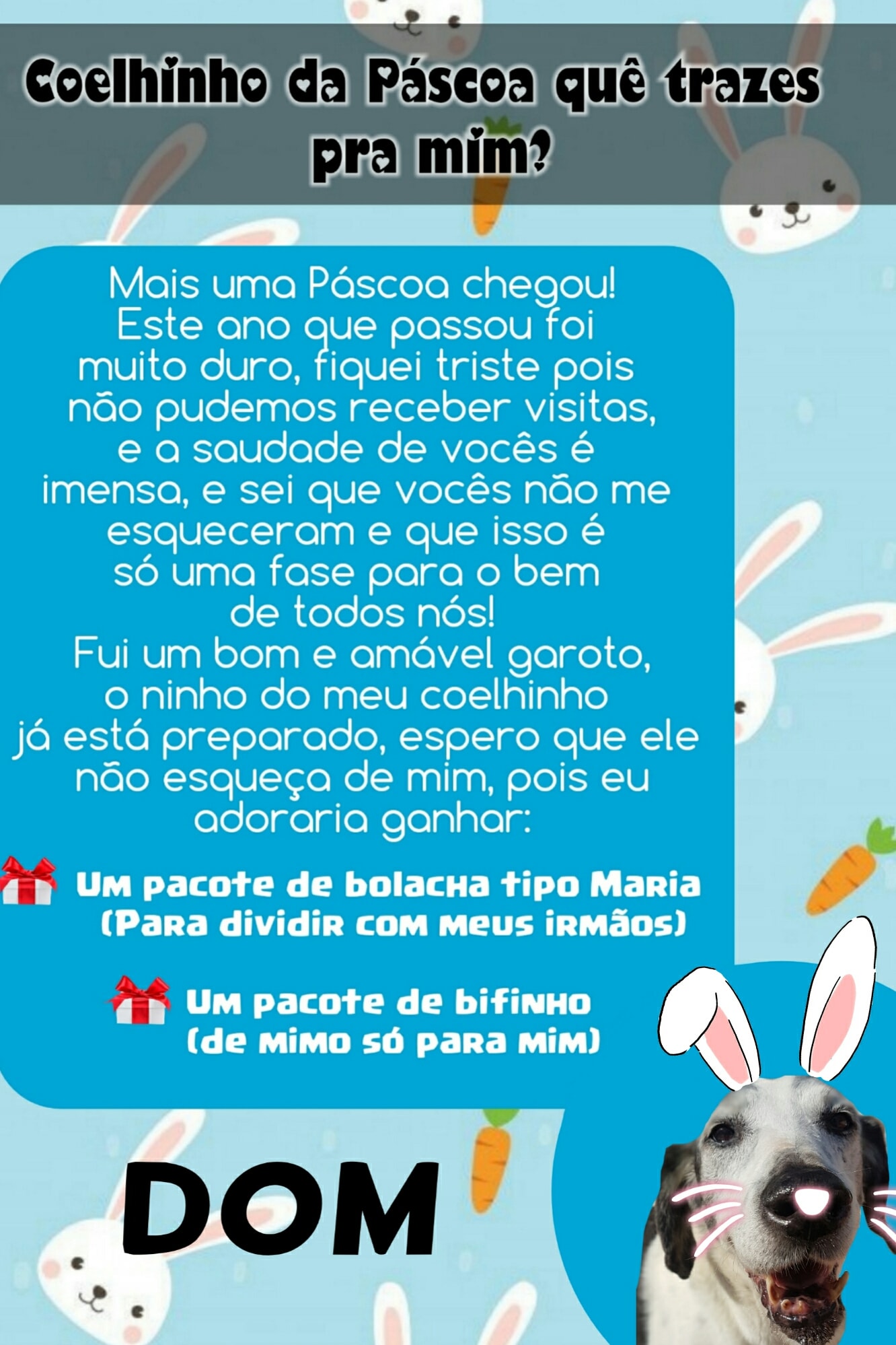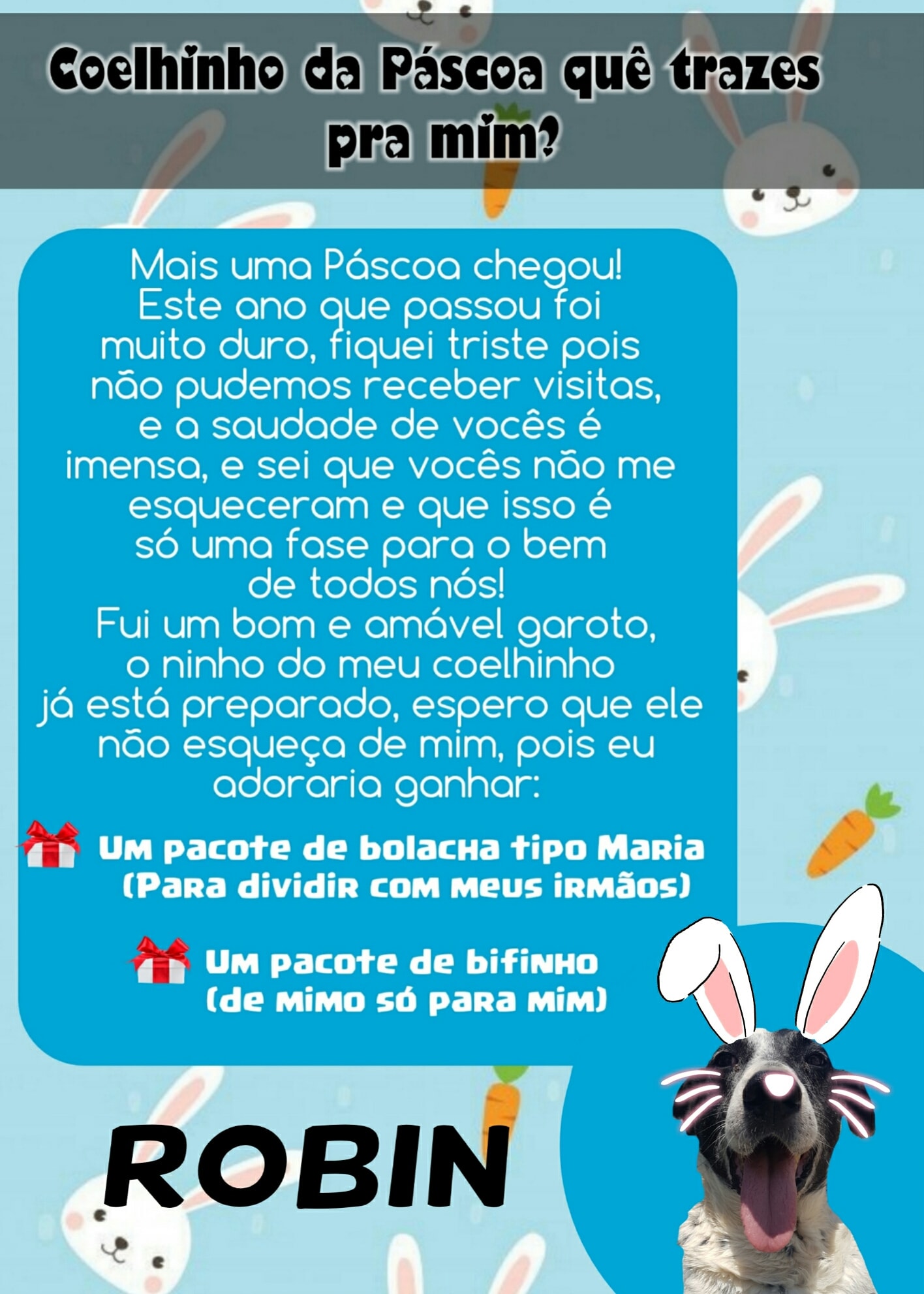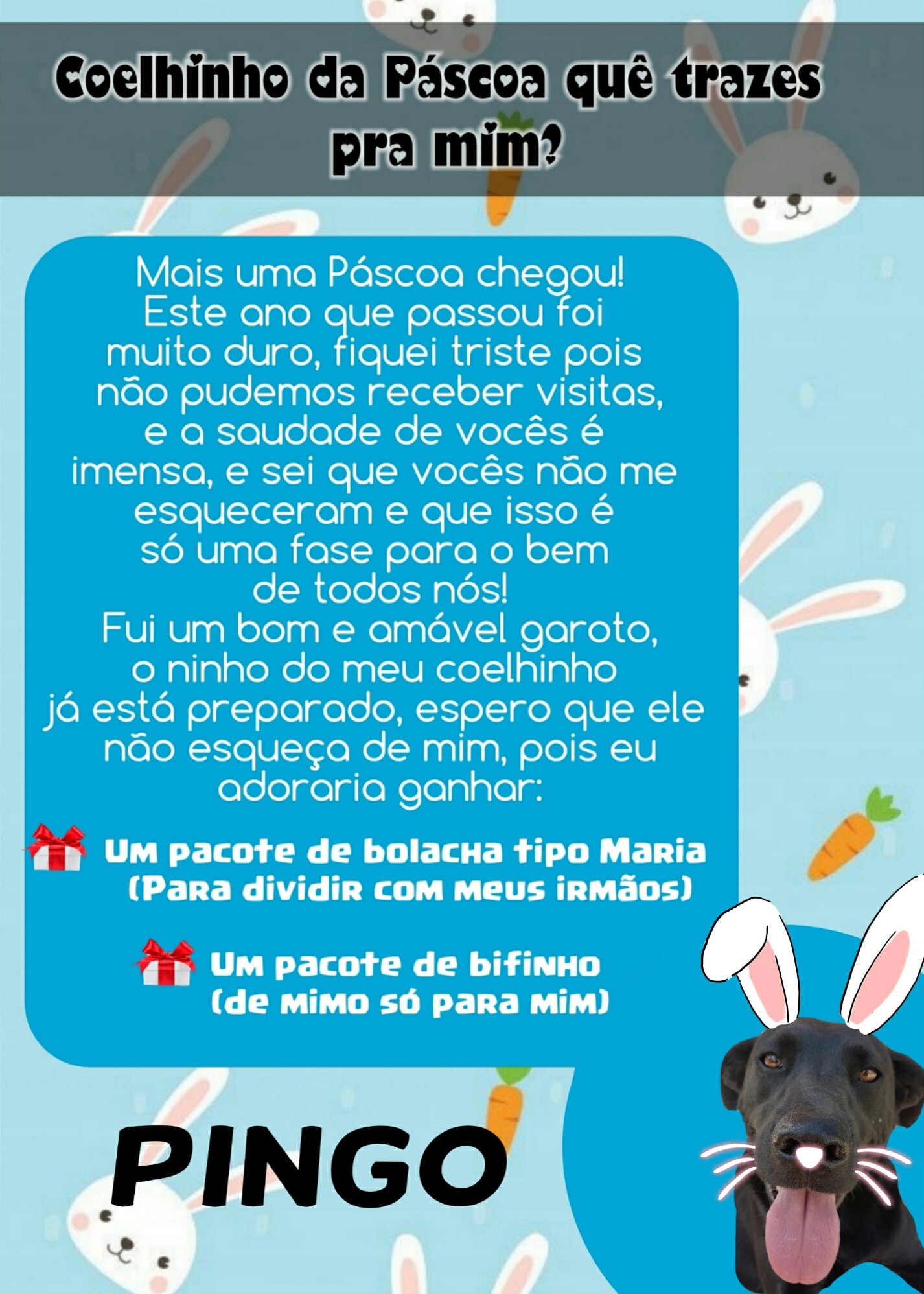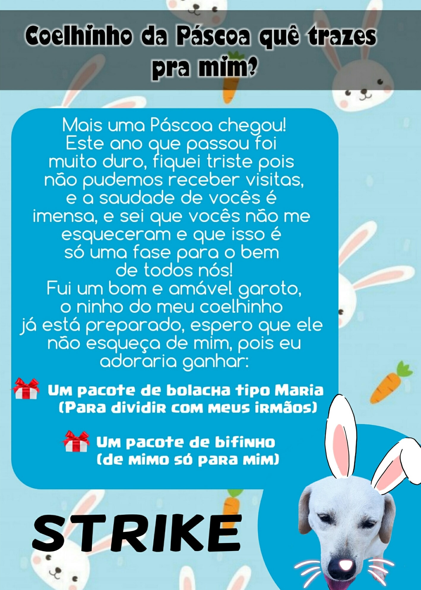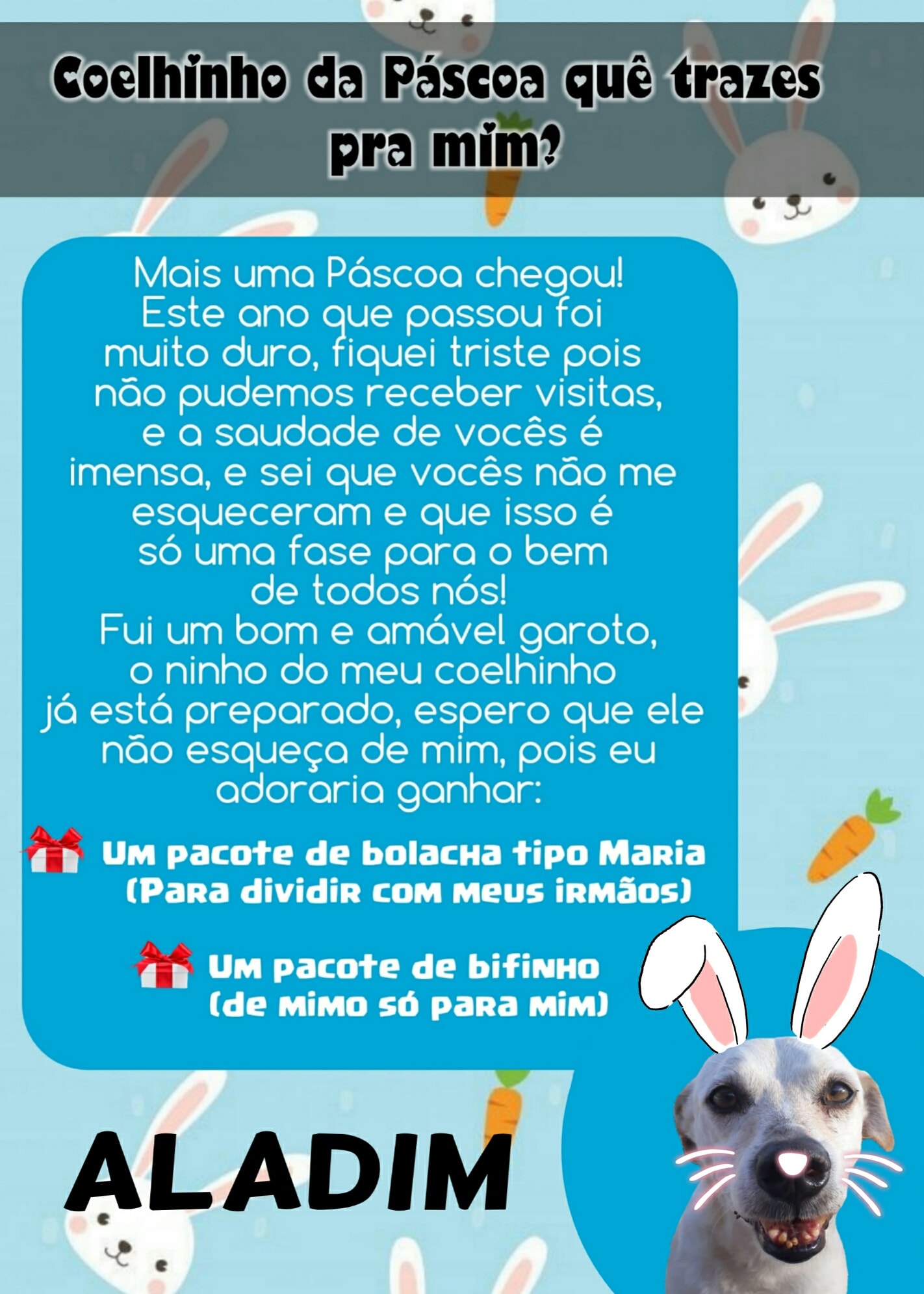 Para esta Páscoa o Abrigo de Cães São Francisco de Assis novamente possui as cartinhas, onde a população pode colaborar doando mimos para os cães (pacote de bolacha tipo Maria ou pacote de bifinho).