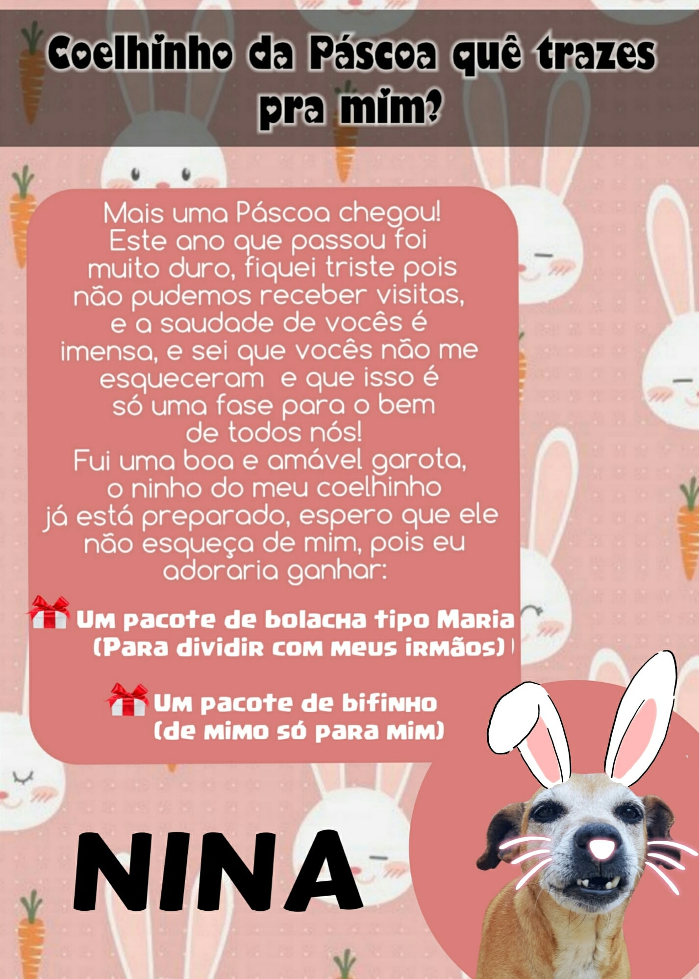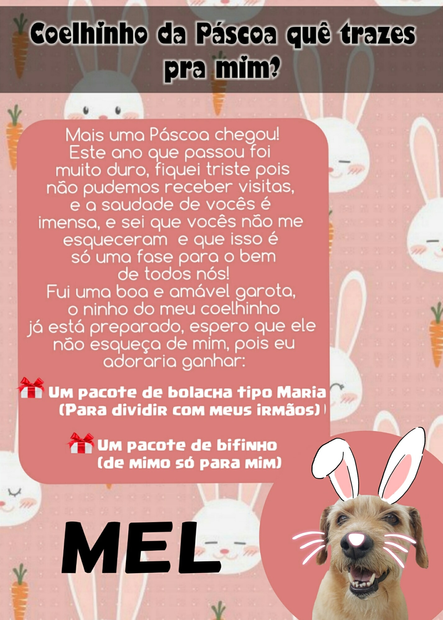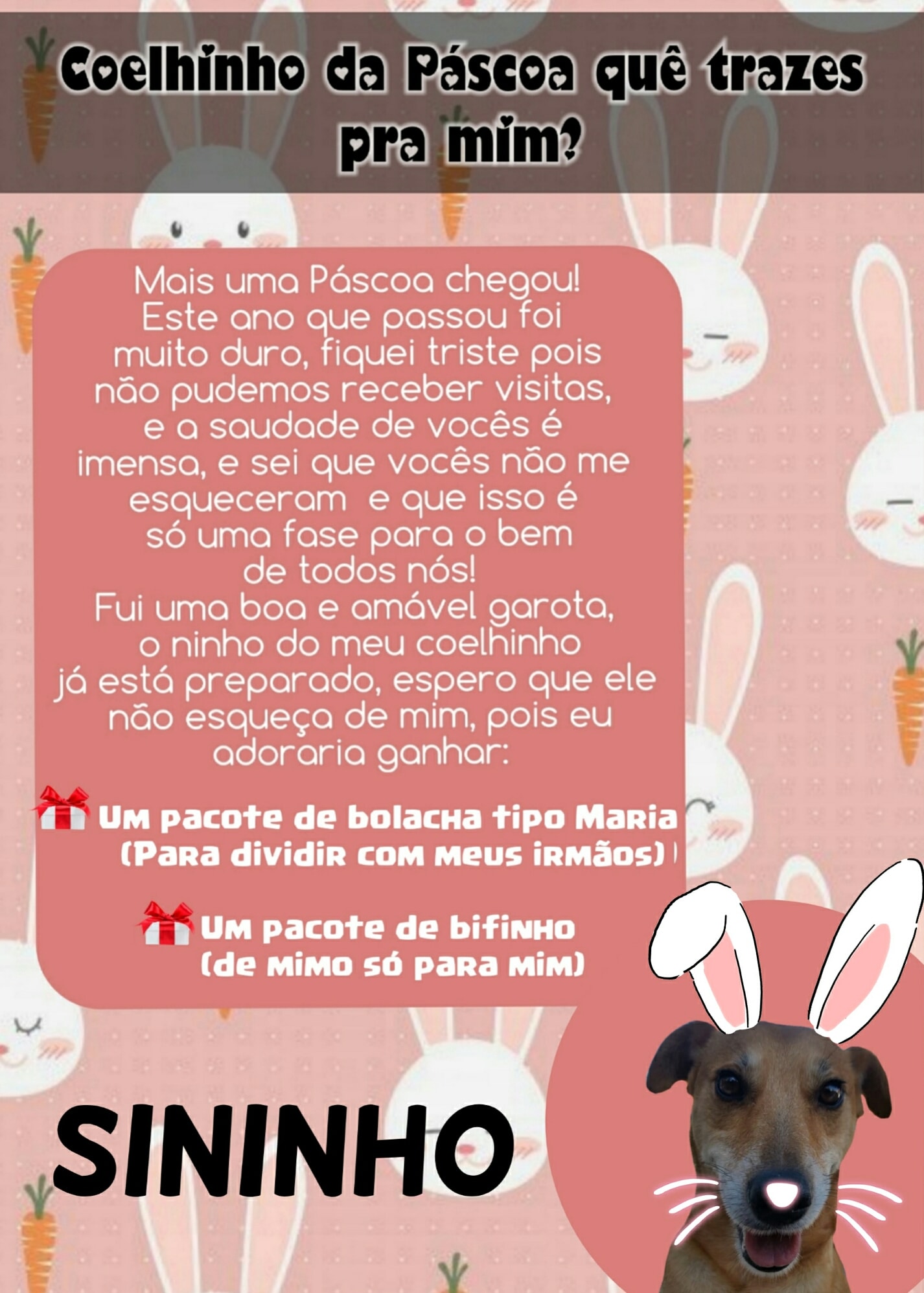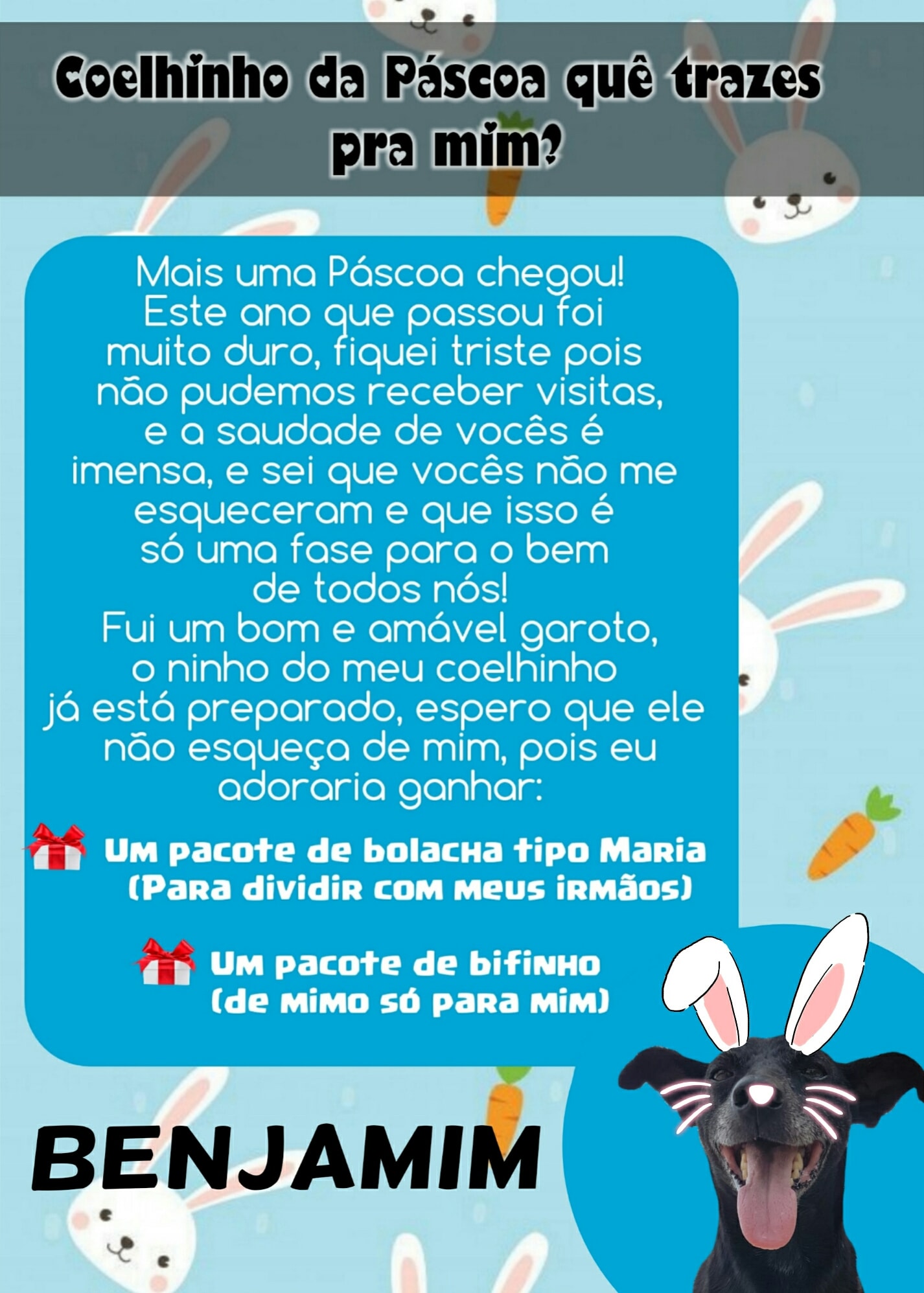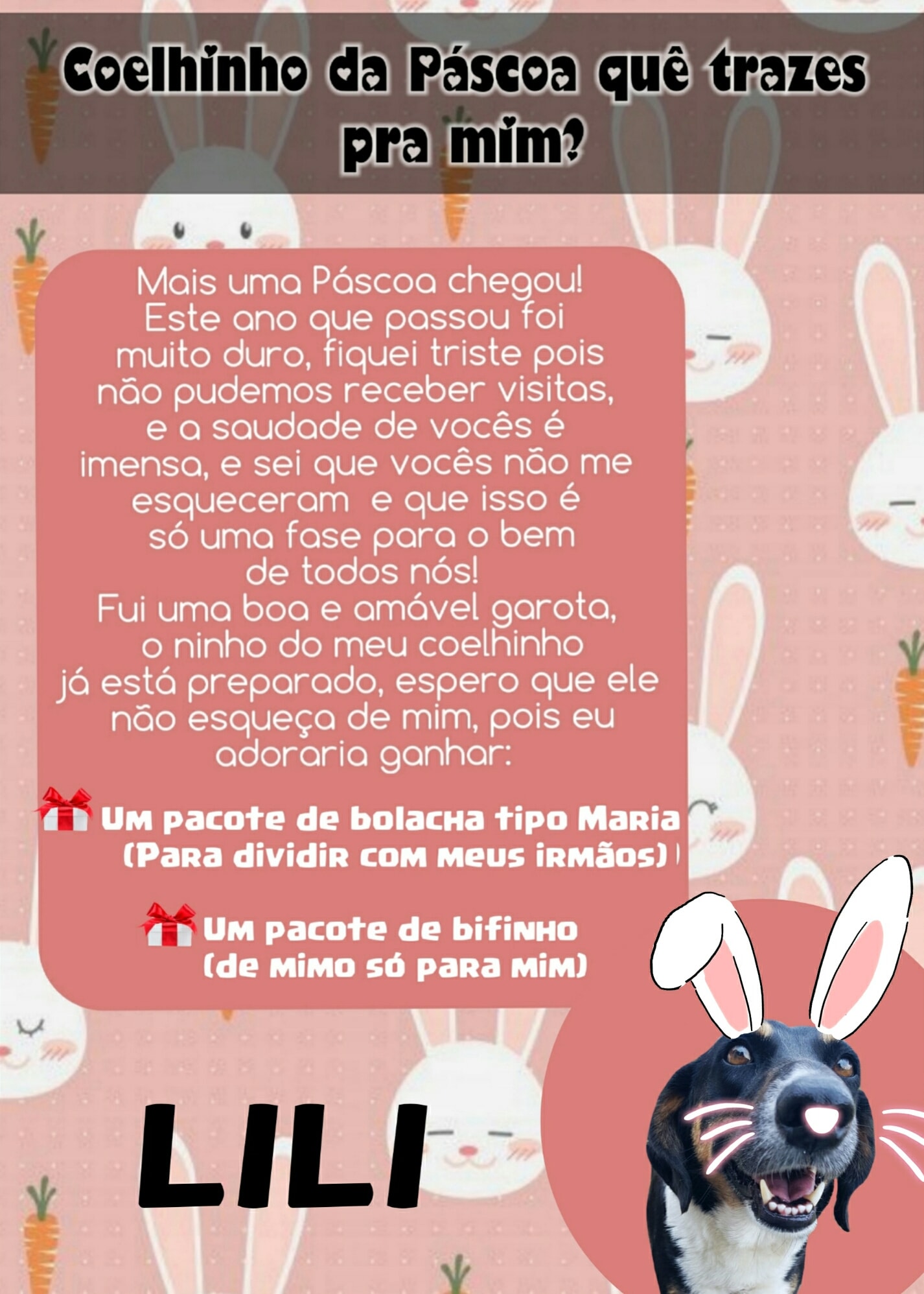 Para esta Páscoa o Abrigo de Cães São Francisco de Assis novamente possui as cartinhas, onde a população pode colaborar doando mimos para os cães (pacote de bolacha tipo Maria ou pacote de bifinho).