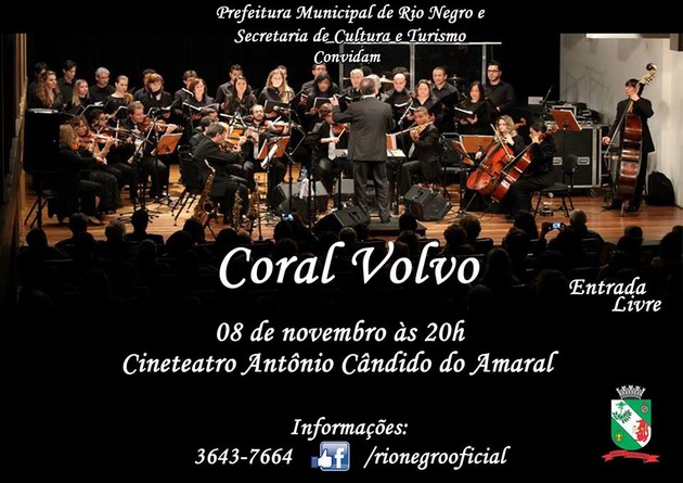 Rio Negro recebe no próximo sábado, 08 de novembro, o Coral Volvo de Curitiba. O evento é realizado pela Prefeitura Municipal de Rio Negro, através da Secretaria de Cultura e Turismo, em parceria com o Sesi. A apresentação acontece no Cine Teatro Antônio Cândido do Amaral, às 20h. A entrada é gratuita e toda a população está convidada.
