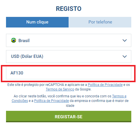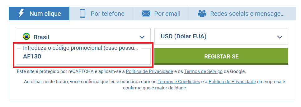 O site vai sugerir a você escolher a forma de registro: num clique só, por número de telefone, através do correio eletrónico, redes sociais ou um mensageiro. A escolha está com você. O que importa é que em cada forma de registro, além de espaços para colocar dados pessoais, vai haver um espaço para introduzir o código promocional.