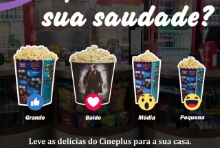 Seja qual for o tamanho da sua saudade de ir ao cinema, você pode buscar a deliciosa pipoca do Cineplus todos os dias das 15h às 21h. 😍🍿