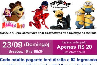 Devido ao grande sucesso, nesta segunda-feira à s 20h terá nova apresentação com as personagens favoritas da criançada. Compre 01 ingresso e ganhe outro. Apenas R$ 20. ——- No próximo domingo (23), será realizado no Cineplus Emacite o Festival da Criança com show teatral ao vivo. Entre as atrações estão: Masha e o Urso, Minions e […]