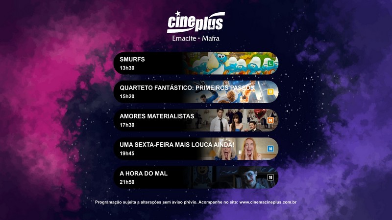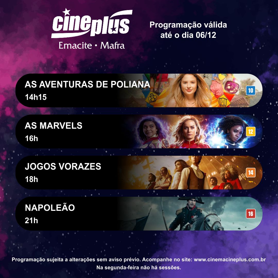 Acompanhe nesta página a programação de filmes em cartaz no cinema em Mafra com as datas e horários das exibições. O Cineplus Emacite possui sistemas modernos de som e projeção de última geração. A projeção é digital, sendo considerada a melhor do mercado cinematográfico nos dias atuais.