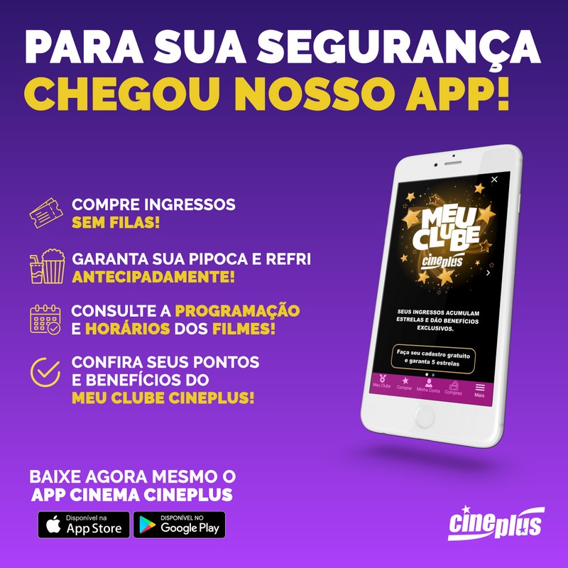 Lembrando ainda que é possível comprar alimentos (pipoca, combos, bebidas, doces, produtos diversos) pelo site (www.cinemacineplus.com.br), aplicativo (CINEMA CINEPLUS) e máquina de autoatendimento.