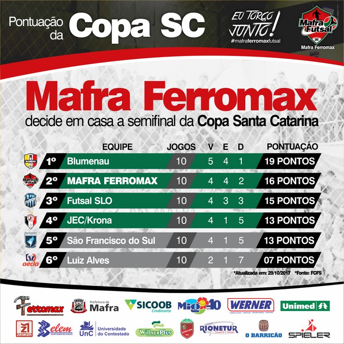 Na busca pelo bicampeonato na Copa Santa Catarina, já classificado para os playoffs, o Mafra Ferromax fechou a primeira fase na segunda colocação na tabela da competição, com 16 pontos computados ao longo de dez partidas. Foram quatro vitórias, quatro empates e apenas duas derrotas.