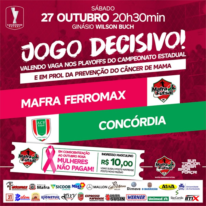 Uma partida onde todos estarão focados em um único objetivo: a classificação! Esse é o foco do Mafra Ferromax para o próximo dia 27 (sábado), às 20h30min, onde recebe a equipe de Concórdia, na decisão da oitava vaga para os playoffs do Campeonato Estadual.