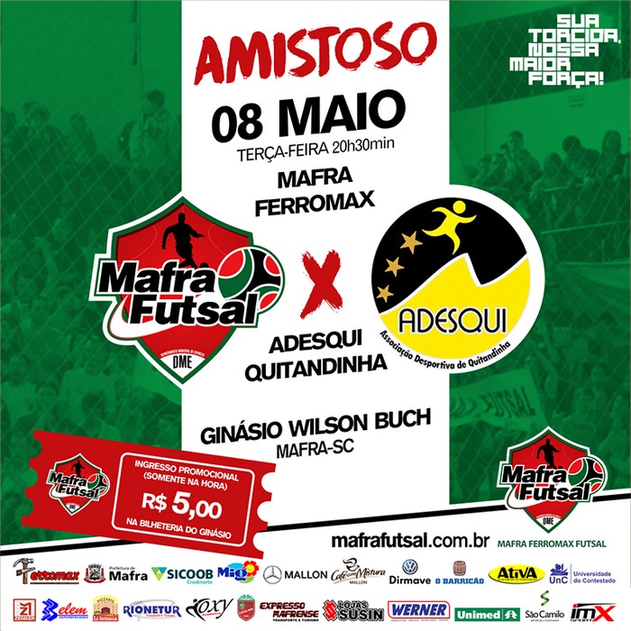 Tendo como palco o Ginásio de Esportes Wilson Buch, o time mafrense recebe a equipe Adesqui, destaque da cidade de Quitandinha-PR. O jogo acontece na terça-feira, dia 08, a partir das 20h30min.