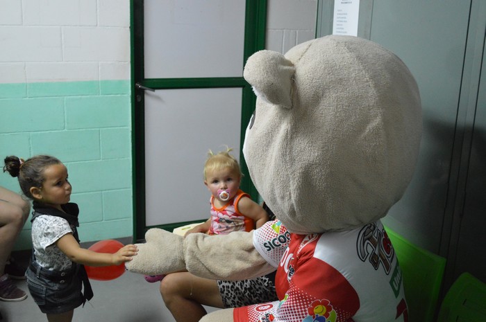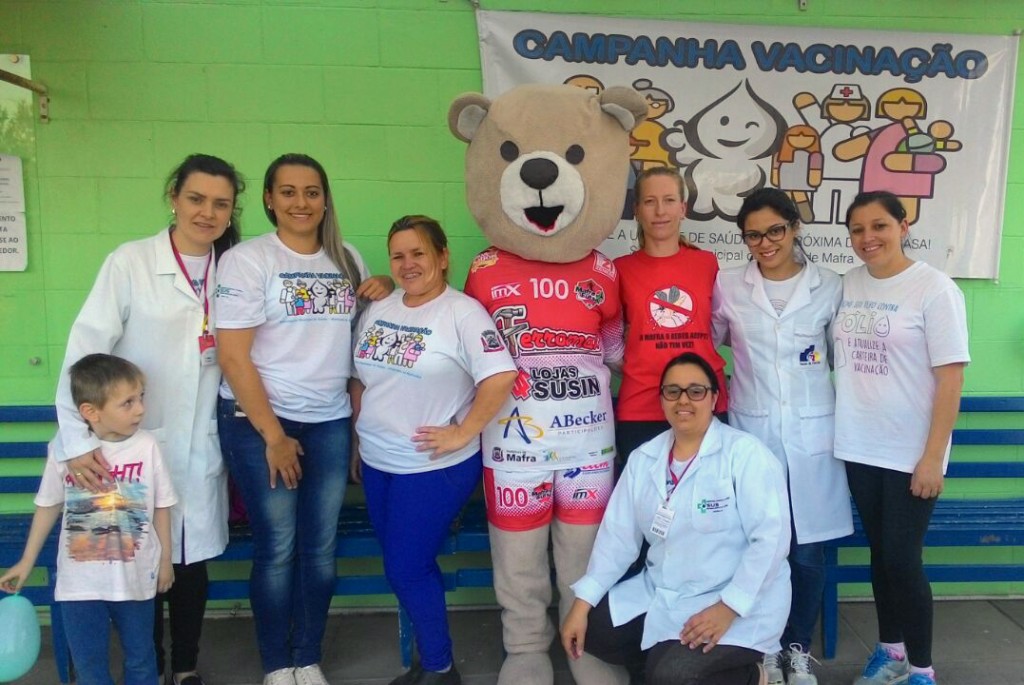 Urso Ted, a conhecida mascote do Mafra Ferromax Futsal, que faz a alegria da criançada por onde passa, participou e divertiu o dia de vacinação no ESF Caic, na Vila das Flores, no último sábado (24).