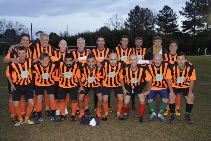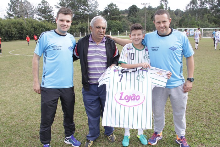 HOMENAGEM – Os professores Hallan Lanski e Tibunga em reconhecimento a Leocádio Consul, idealizador desta escolinha, que hoje leva o nome de Escola Futebol Metropol/Milionários da Bola, foi homenageado recebendo uma camisa do extinto Metropol de Criciúma, equipe que defendeu em 1967 e 1968.