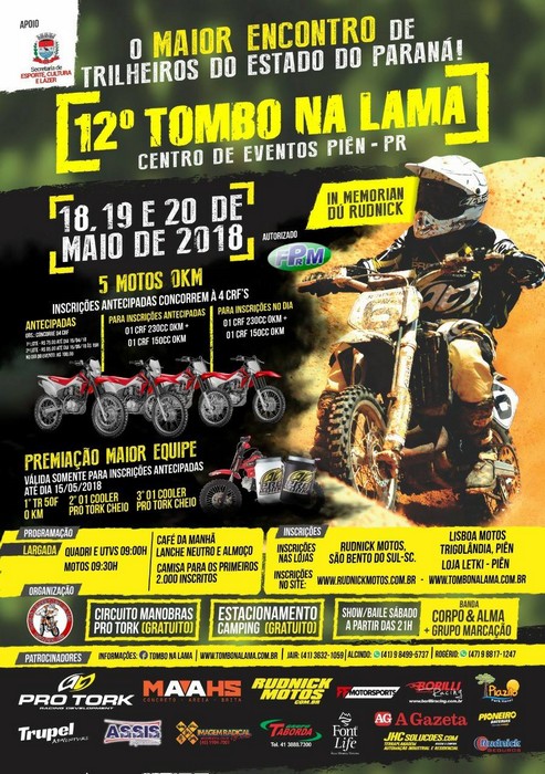 Patrocinadores: Pro Tork, Rudnick Motos, Grupo Taborda, Maahs Areia, Brita e Concreto, Pneus Borilli, Baterias Pioneiro, Imagem Radical, Jornal A Gazeta, FF motorsport, Truppel Adventure, ASSIS Supermercados, Font Life Agua Mineral, JHC Soluções, Recanto do Piazito, Rudnick Corretora de Seguros. Apoio da Secretaria de Esporte, Cultura e Lazer de Piên.