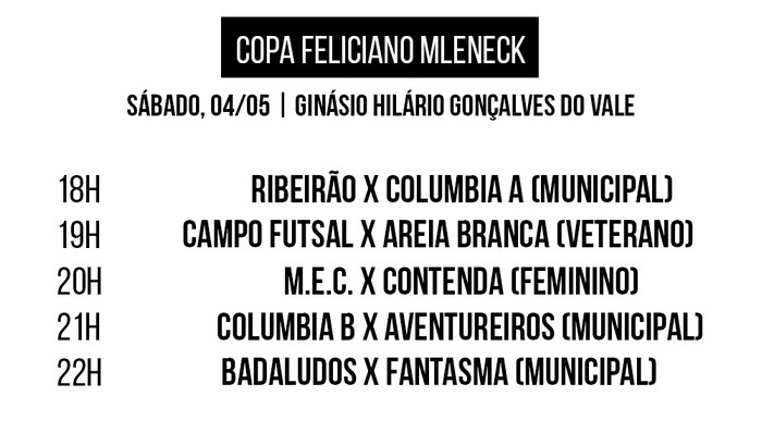 Começaram, no último sábado (27), as rodadas da Copa Feliciano Mleneck de Futsal em Quitandinha. Organizado pela Associação Desportiva de Quitandinha (Adesqui), com apoio da Prefeitura Municipal e a secretaria de Educação, Cultura e Esportes, o campeonato é disputado nas categorias Feminino Intermunicipal, Veterano Intermunicipal e Municipal livre.