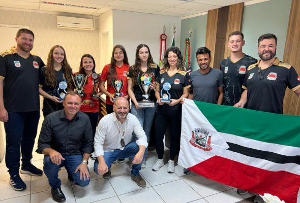 Atletas de ouro de basquetebol apresentam troféus ao prefeito de Mafra