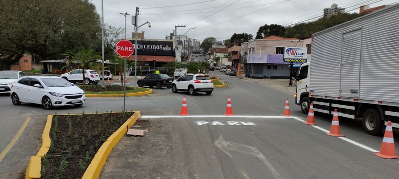 – para quem estiver na Rua Marechal Floriano Peixoto e continuar seguindo a via, há sinalização de PARE antes de entrar na rotatória;