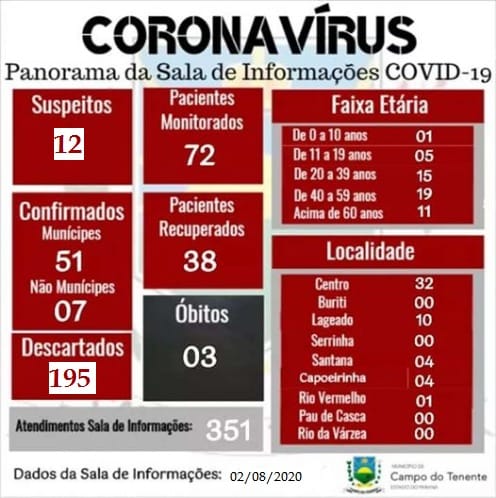 Campo do Tenente está no segundo dia sem novos casos de Covid-19 confirmados. Confira os dados atualizados pela Sala de Informações COVID-19 neste domingo (02):