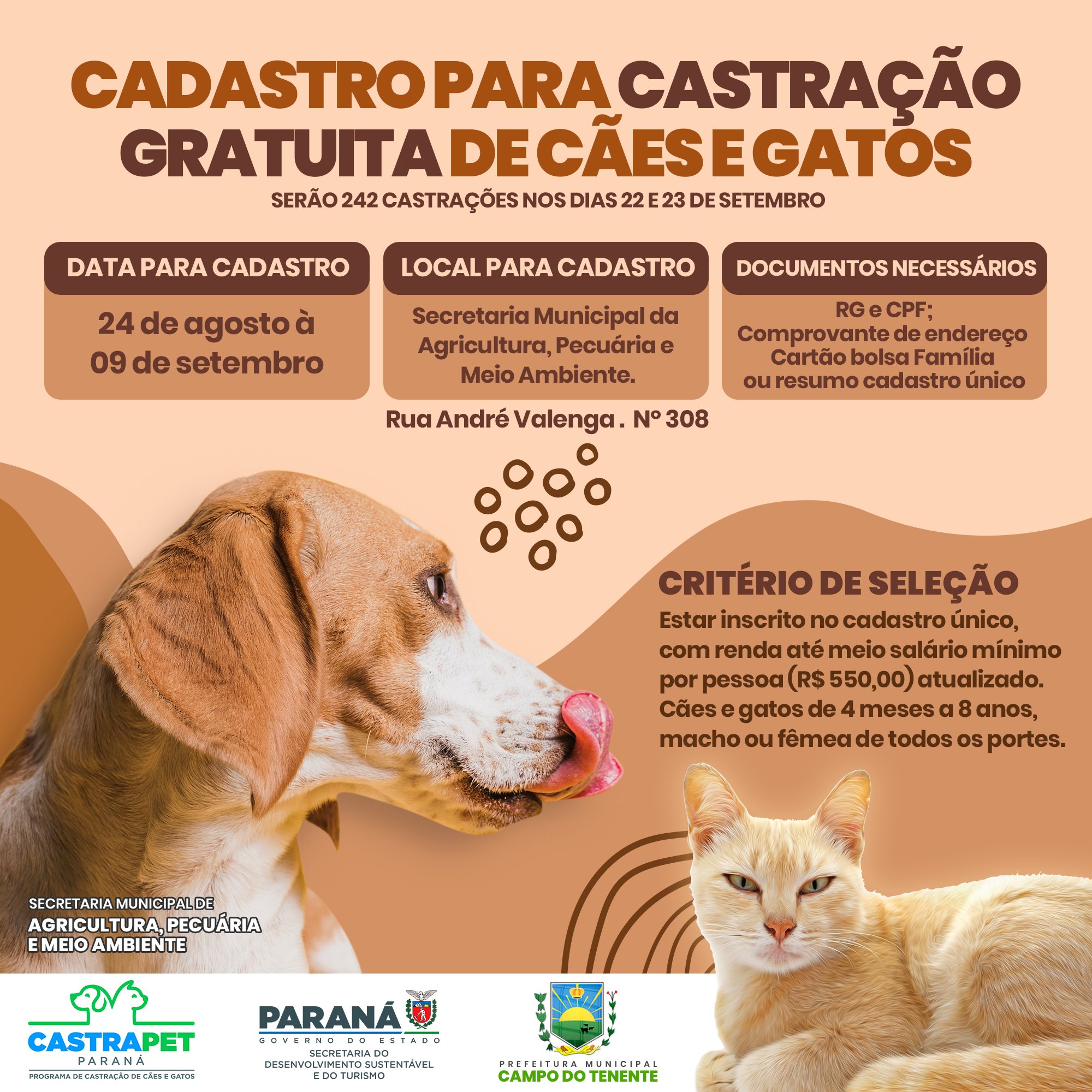 Devem ser apresentados documentos pessoais e de comprovação de endereço atualizado, dados do pet e documentos comprobatórios como Bolsa Família ou resumo atualizado do CadÚnico (retirar no CRAS), além da assinatura do termo de responsabilidade pela castração, que deve ser feita presencialmente. Não serão aceitos cadastros por telefone.
