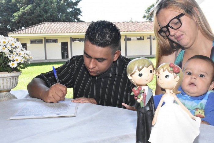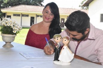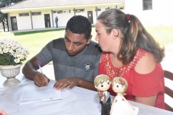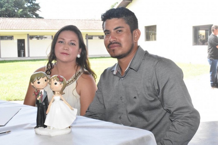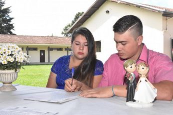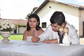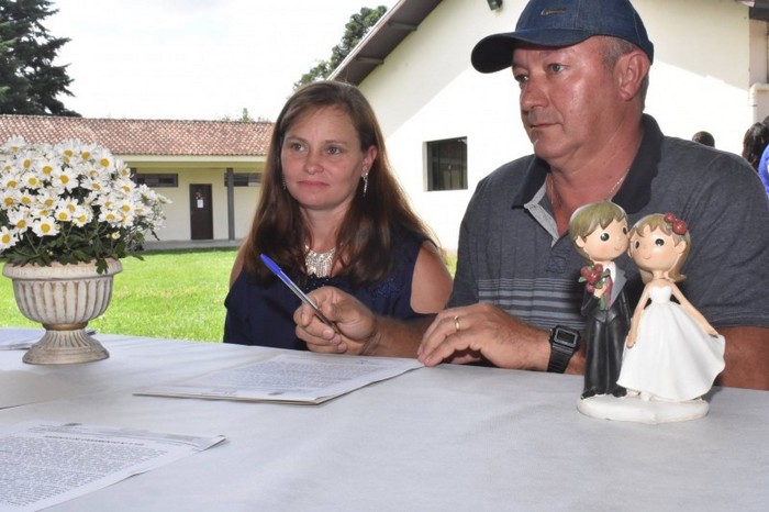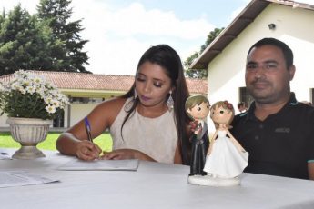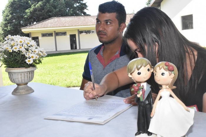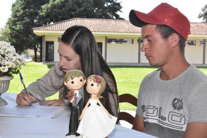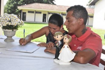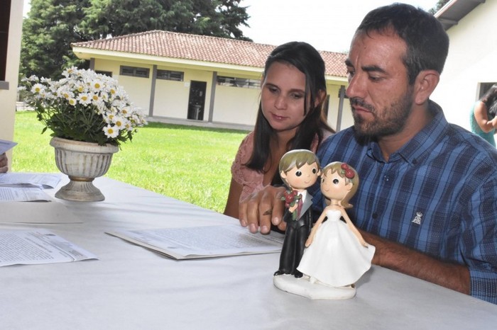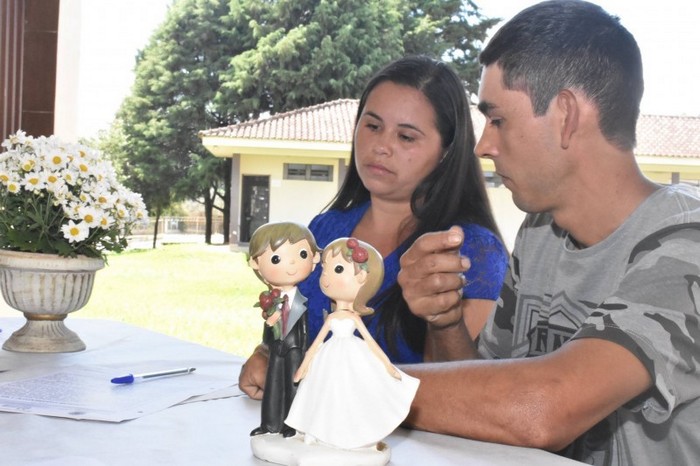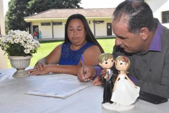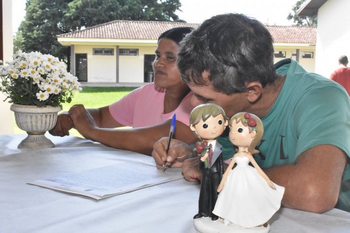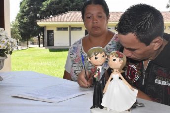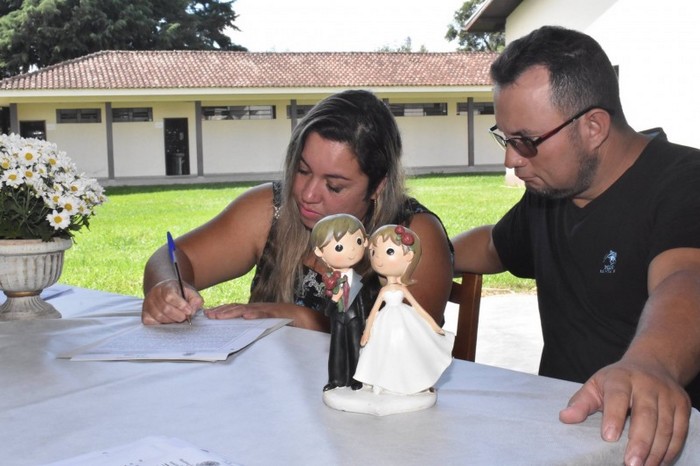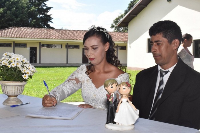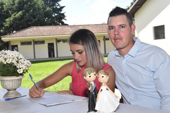 Um dos 50 casais inscritos na cerimônia coletiva, aproveitamos o evento para formalizar união. O casal aguardava há três anos pela oportunidade. “Sempre foi um sonho. Para mim significa constituir família, é algo legítimo. Não tivemos condição de casar antes porque só ele estava trabalhando. Dei meu nome no CRAS para participar minha cunhada me avisou que viu na internet. Temos planos para casar na igreja no ano que vem”, relata a moradora do bairro Azaleia.
