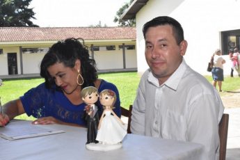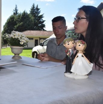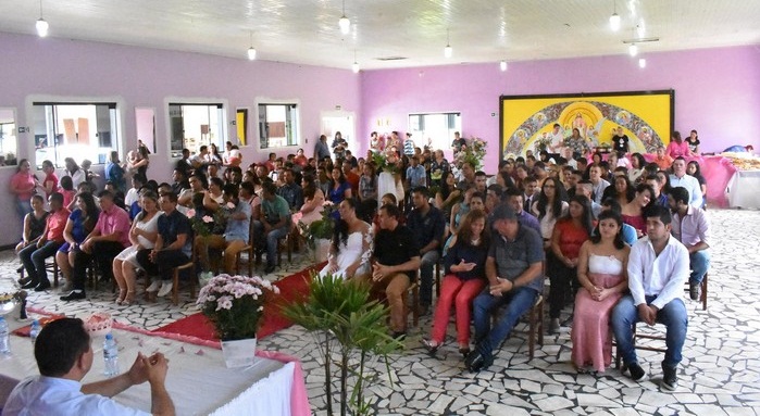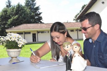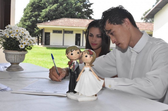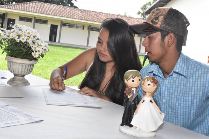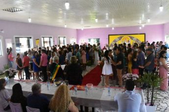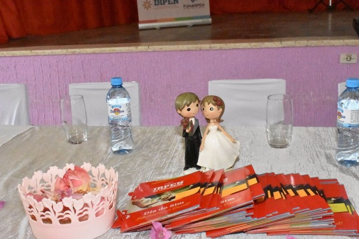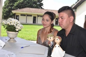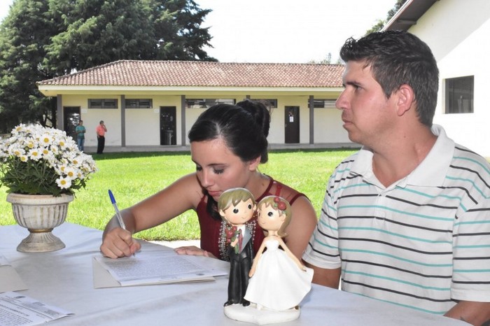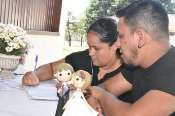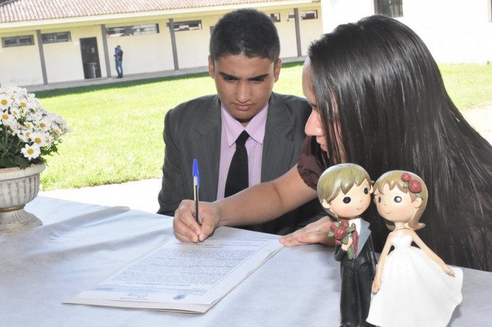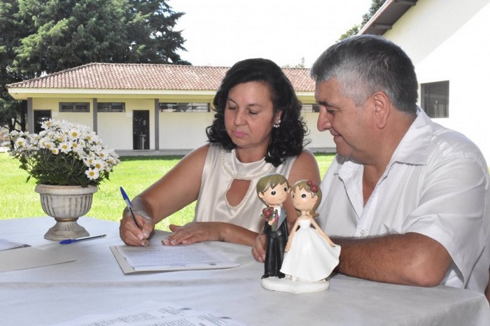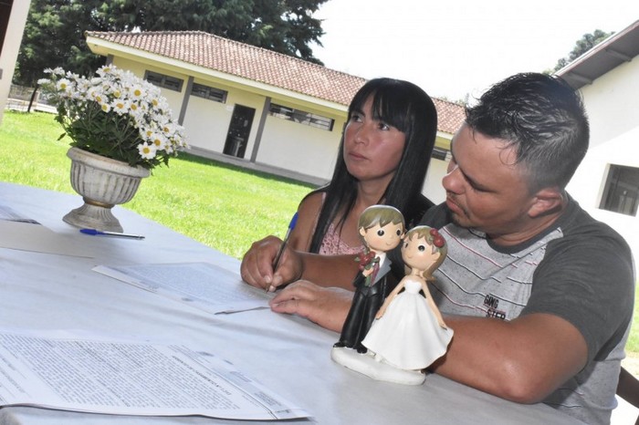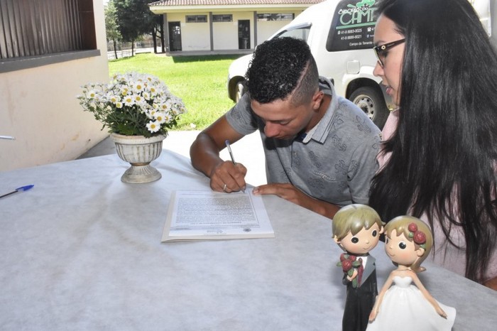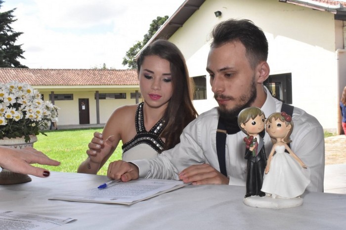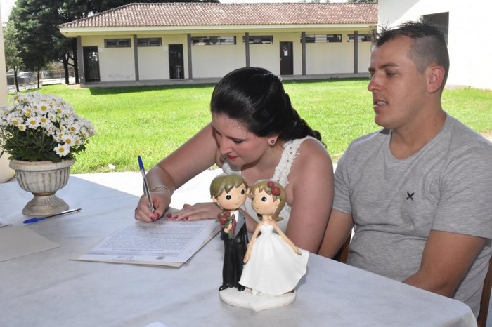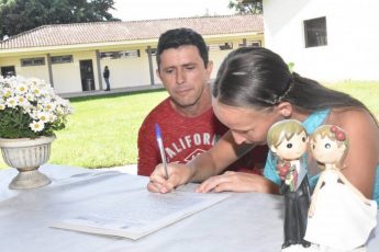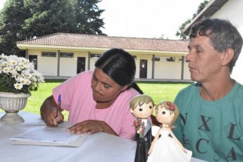 Um dos 50 casais inscritos na cerimônia coletiva, aproveitamos o evento para formalizar união. O casal aguardava há três anos pela oportunidade. “Sempre foi um sonho. Para mim significa constituir família, é algo legítimo. Não tivemos condição de casar antes porque só ele estava trabalhando. Dei meu nome no CRAS para participar minha cunhada me avisou que viu na internet. Temos planos para casar na igreja no ano que vem”, relata a moradora do bairro Azaleia.