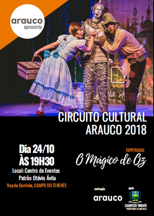 A Secretaria Municipal de Educação de Campo do Tenente em parceria com a Empresa Arauco proporcionara o Circuito Cultural 2018 e com muita alegria convidamos a todos para participar. Traga sua família e amigos para assistir conosco ao Espetáculo o Mágico de OZ, será realizado no dia 24 de outubro com início às 19h30min no Centro de Eventos Patrão Otavio Ávila Rua da Serrinha Campo do Tenente. Essa iniciativa faz parte dos Projetos Socioambientais desenvolvidos pela Arauco alinhados ao Valor de Bom Cidadão. A secretária de Educação Marilene Aparecida Hornick comenta da importância da parceria com a Empresa Arauco e o quanto ela representa para o nosso município, pois sempre nos presenteia com excelentes espetáculos e palestrante proporcionando aos nossos alunos, professores e comunidade em geral mais cultura e conhecimento.