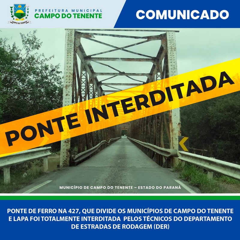 A prefeitura de Campo do Tenente publico o comunicado sobre a interdição por tempo indeterminado da ponte metálica por motivo de segurança.